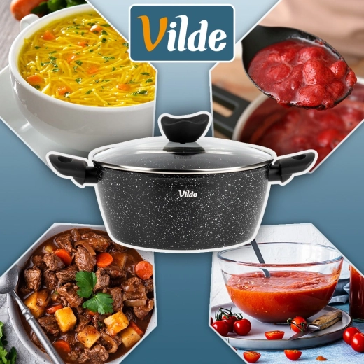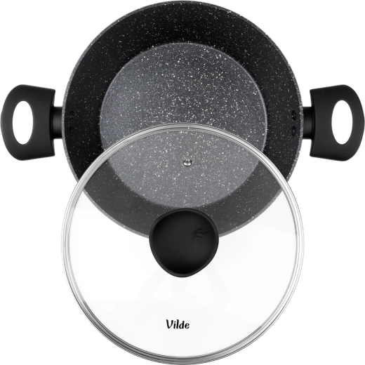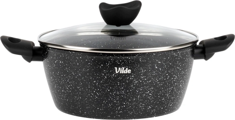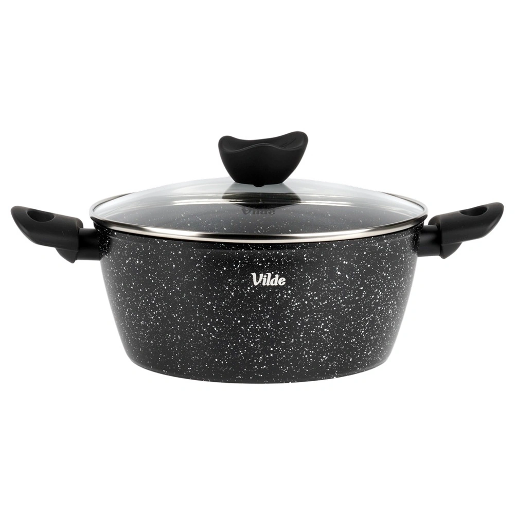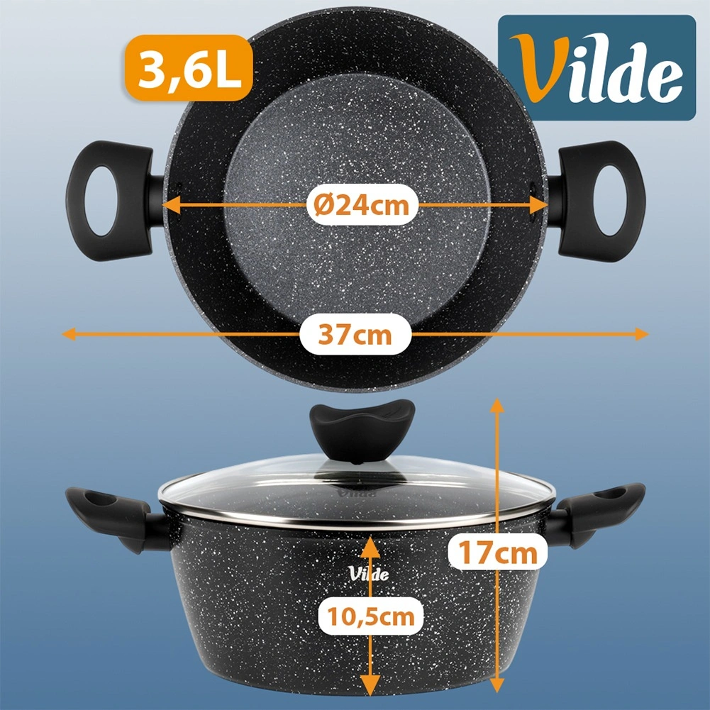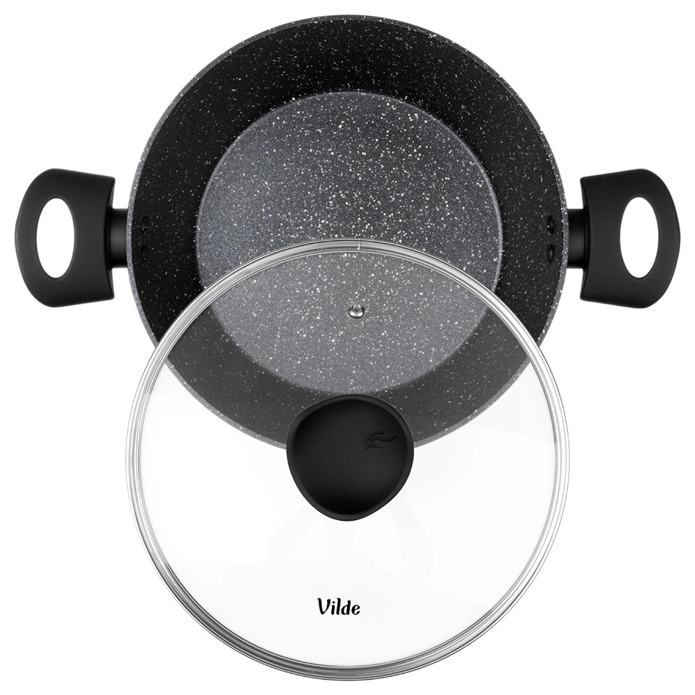 Oală elegantă din granit cu diametrul de 24 cm și volumul de 3,6 l, ideală pentru gătitul zilnic al supelor, sosurilor și pentru înăbușire. Stratul antiaderent din granit în trei straturi asigură distribuție uniformă a căldurii și eliberarea ușoară a preparatelor fără ardere – pentru gătit mai gustos și mai sănătos, cu minimum de ulei.