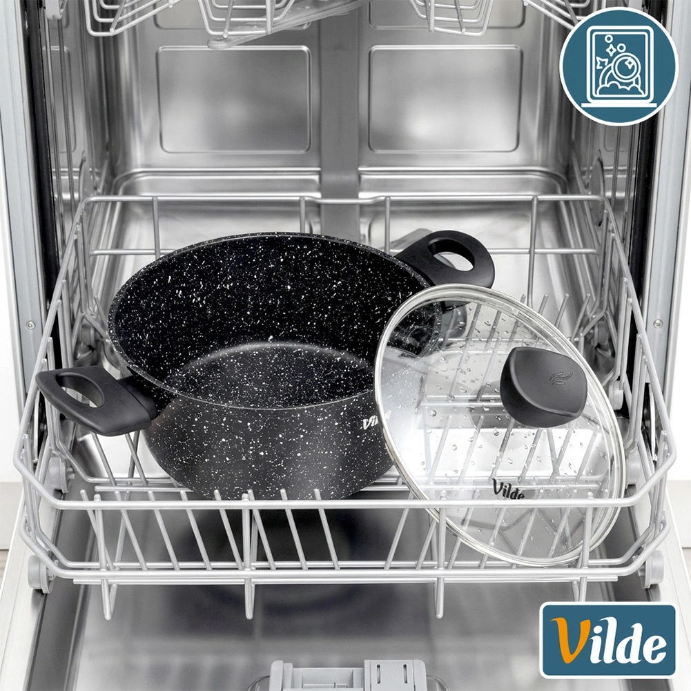 Fundul multistrat cu placă pentru inducție asigură încălzire eficientă și uniformă pe toate tipurile de plite, inclusiv pe inducție.