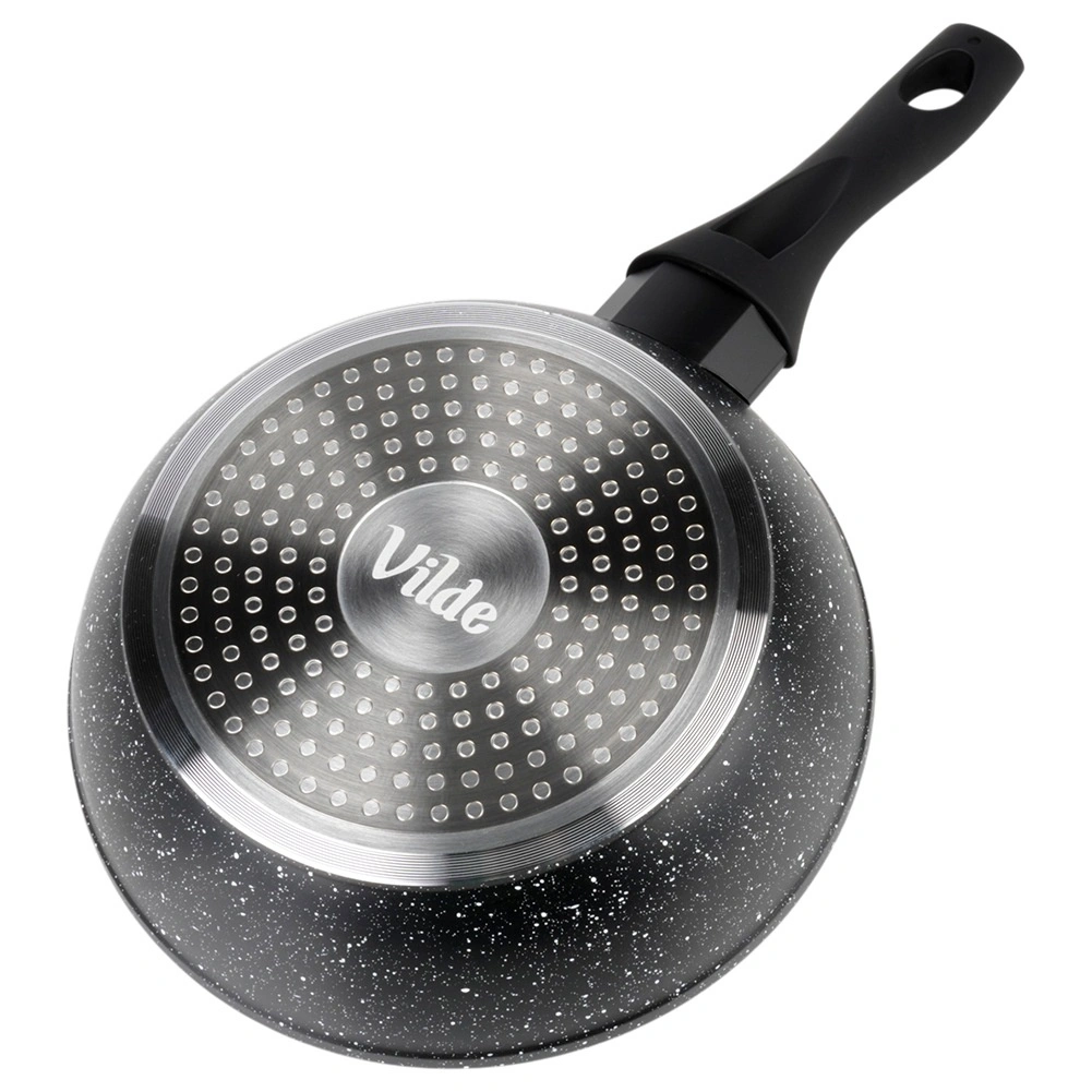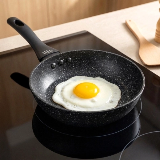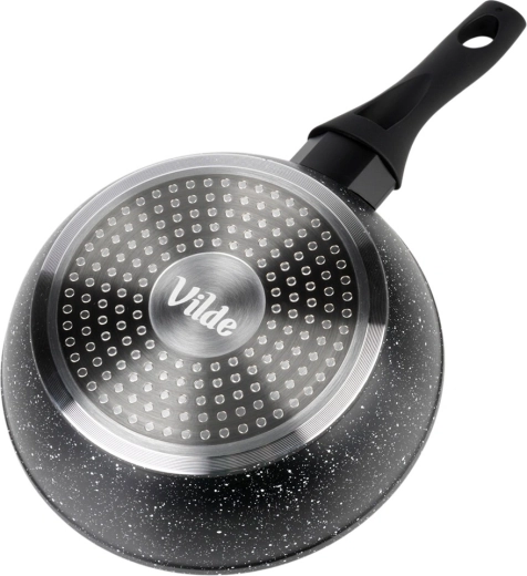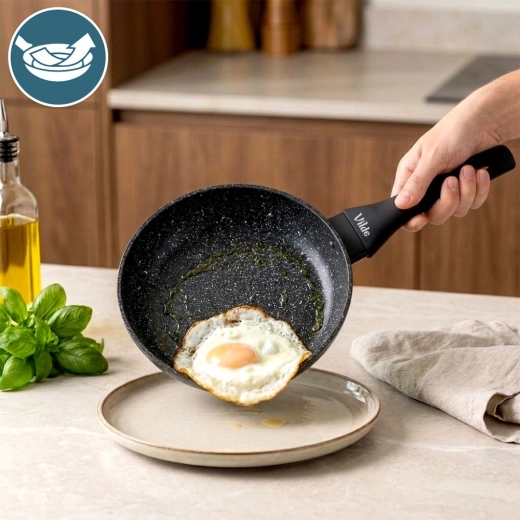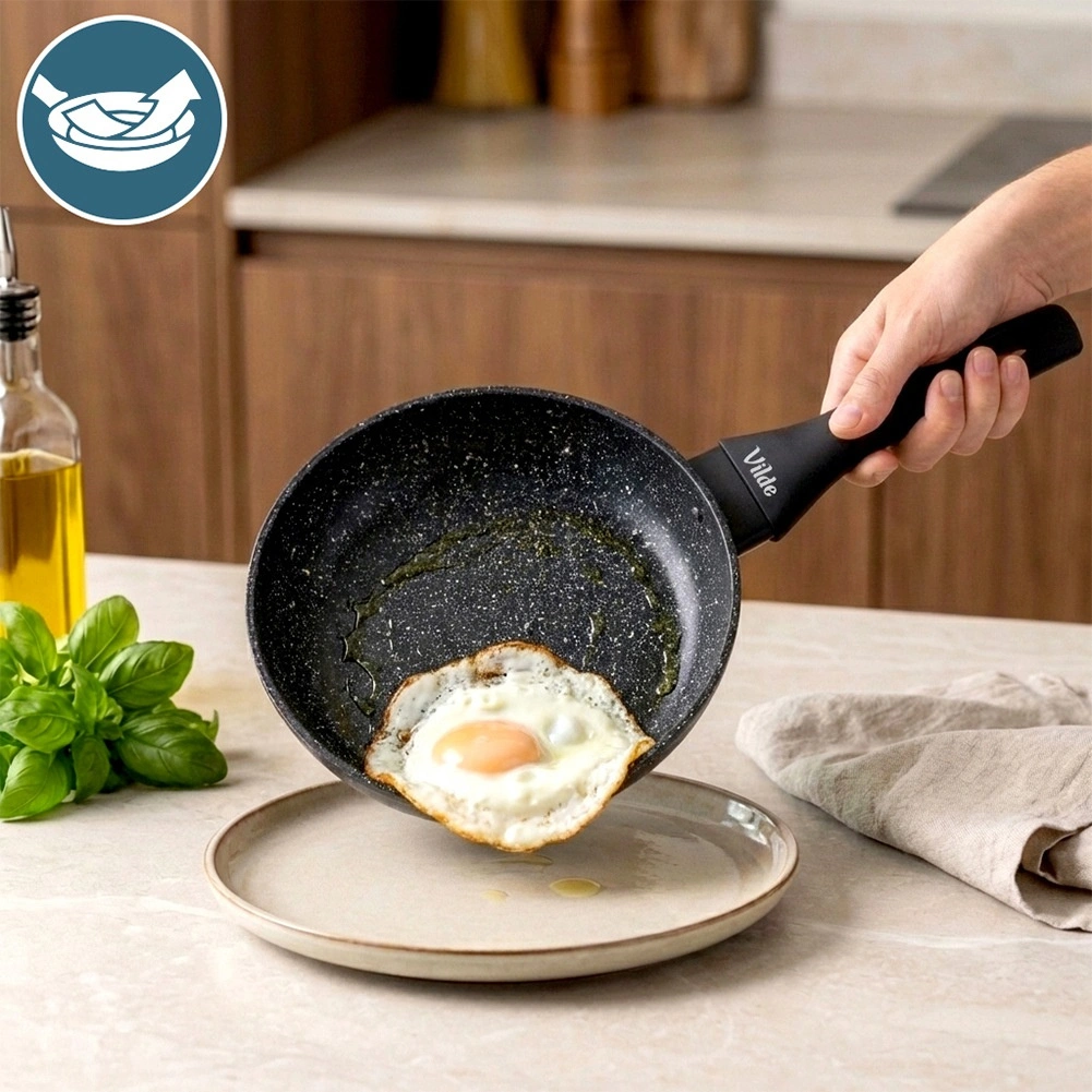Fundul masiv distribuie eficient căldura pe întreaga suprafață a tigăii, economisind timp și energie și asigurând rezultate uniforme.
