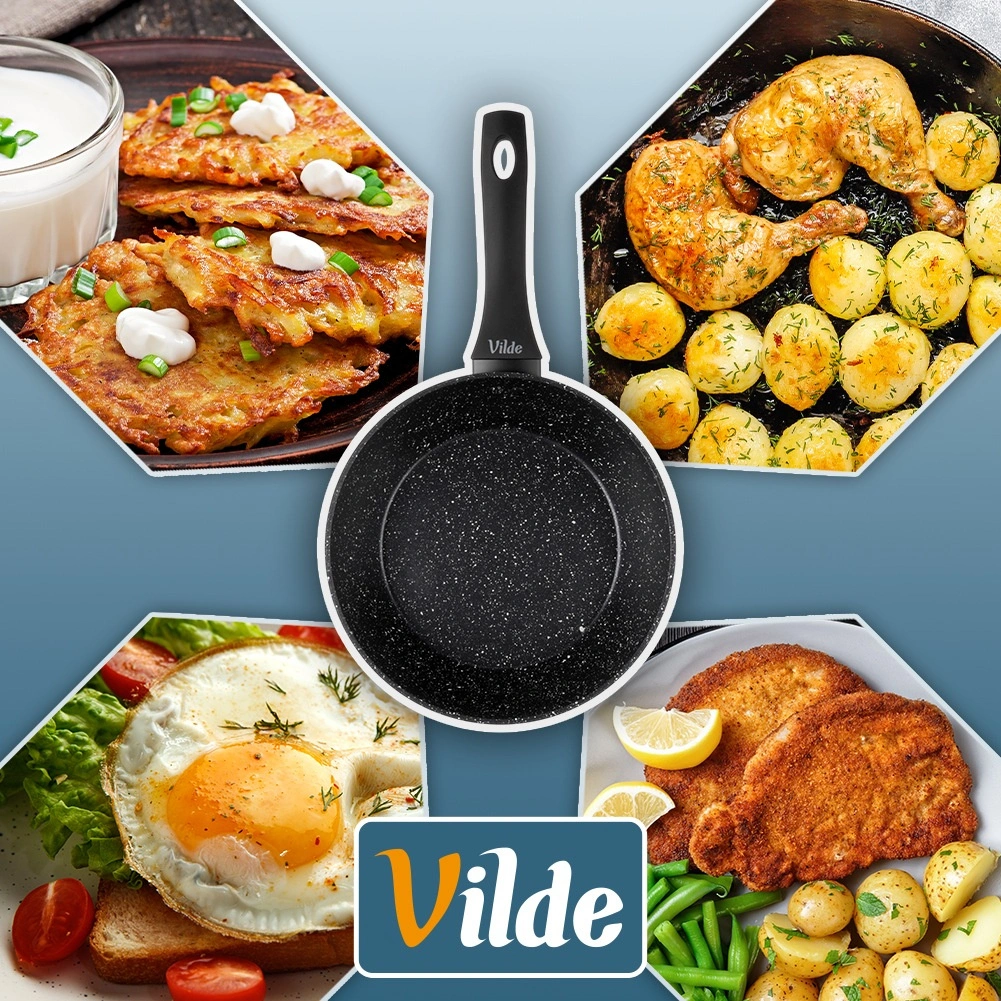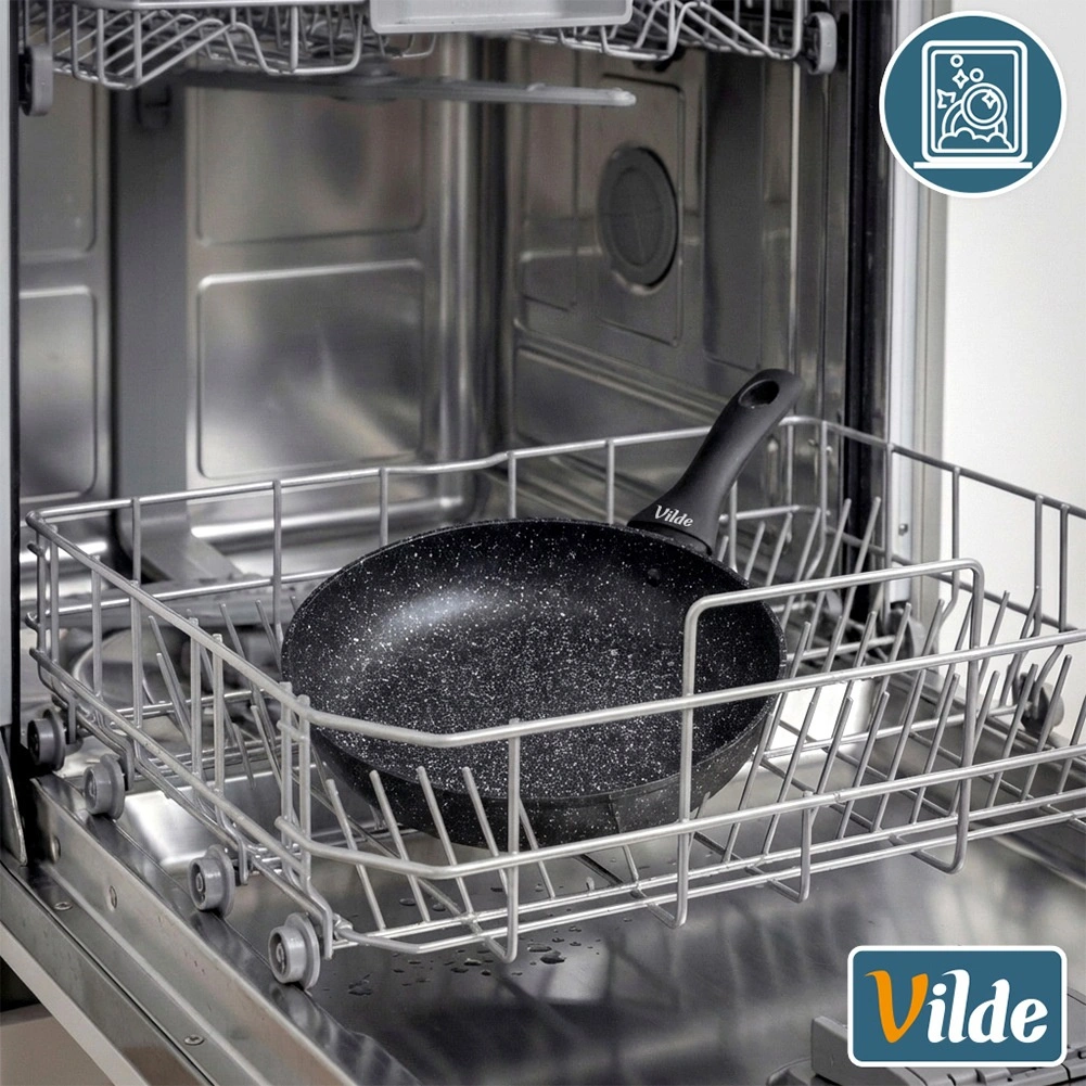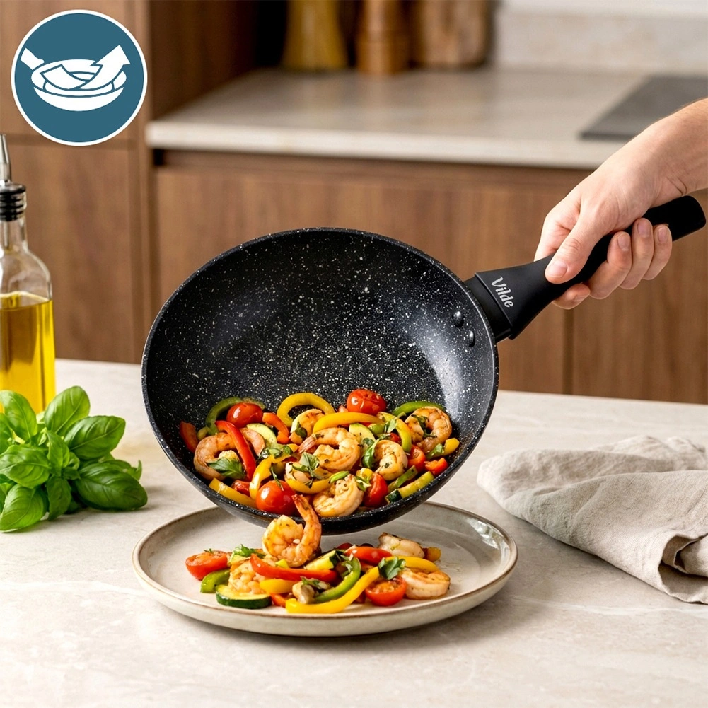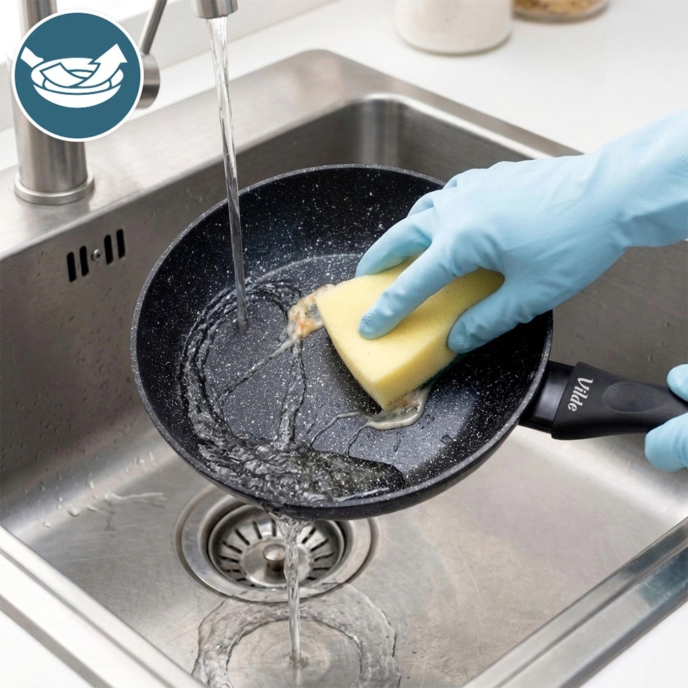Mânerul ergonomic, rezistent la căldură, asigură o prindere sigură. După gătit, tigaia se spală ușor și este potrivită și pentru mașina de spălat vase.