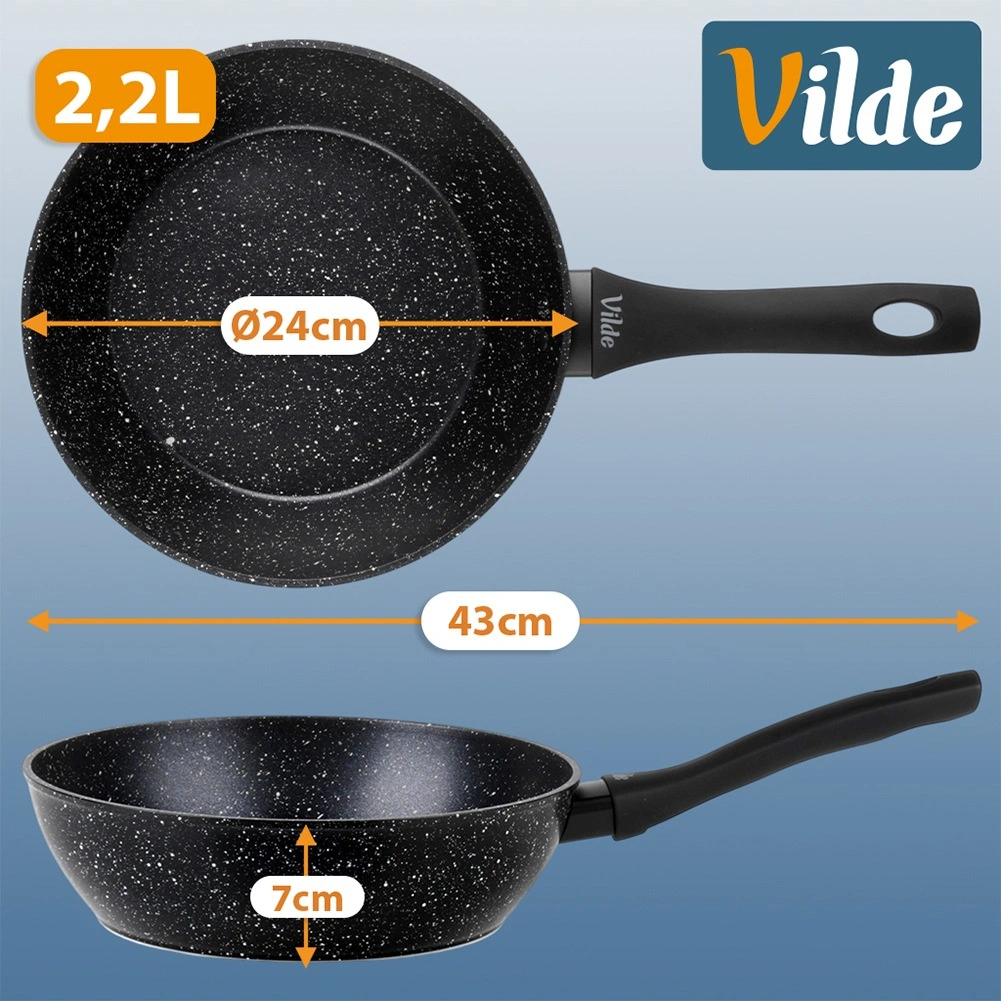 - Dimensiuni practice: diametru 24 cm, înălțimea tigăii 6,8 cm, lungime 43 cm, volum 2,2 l