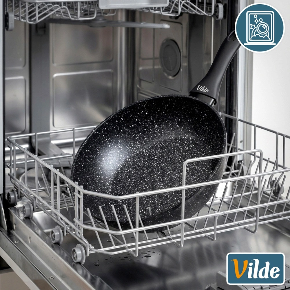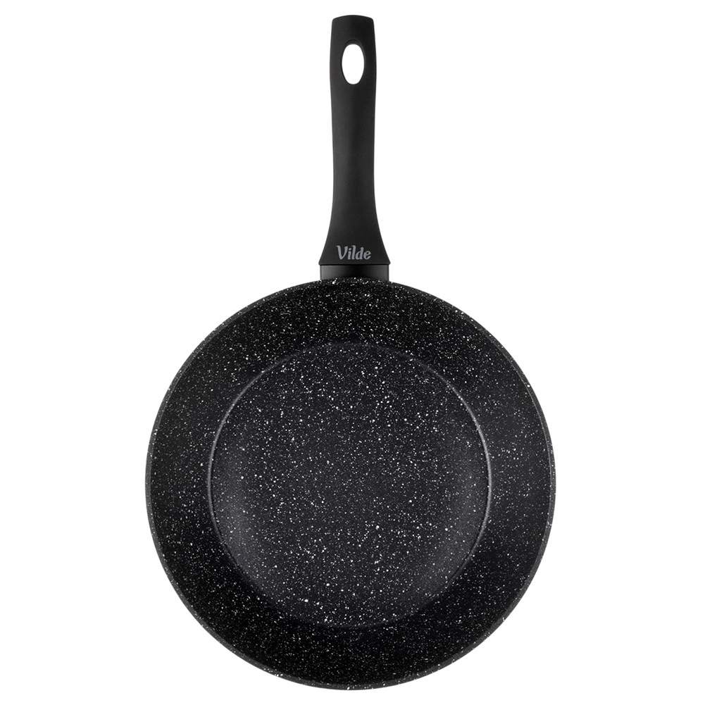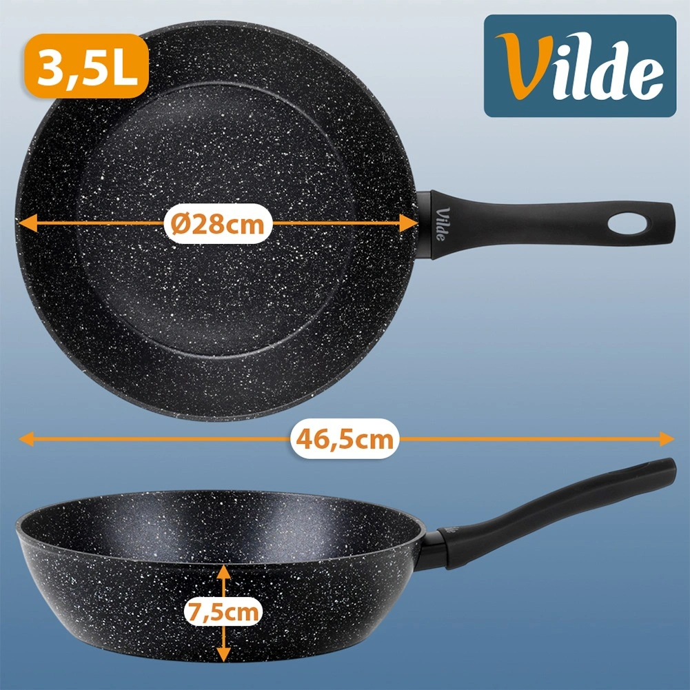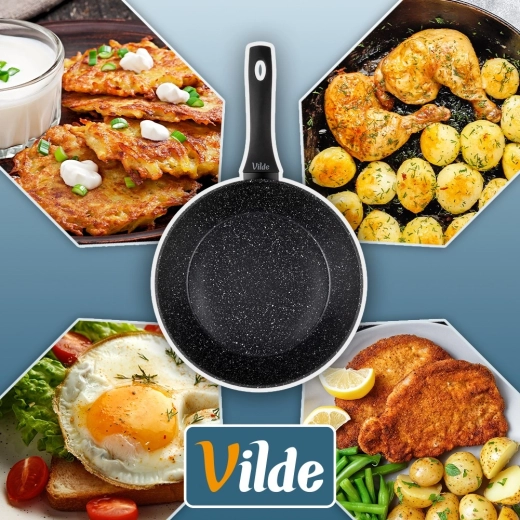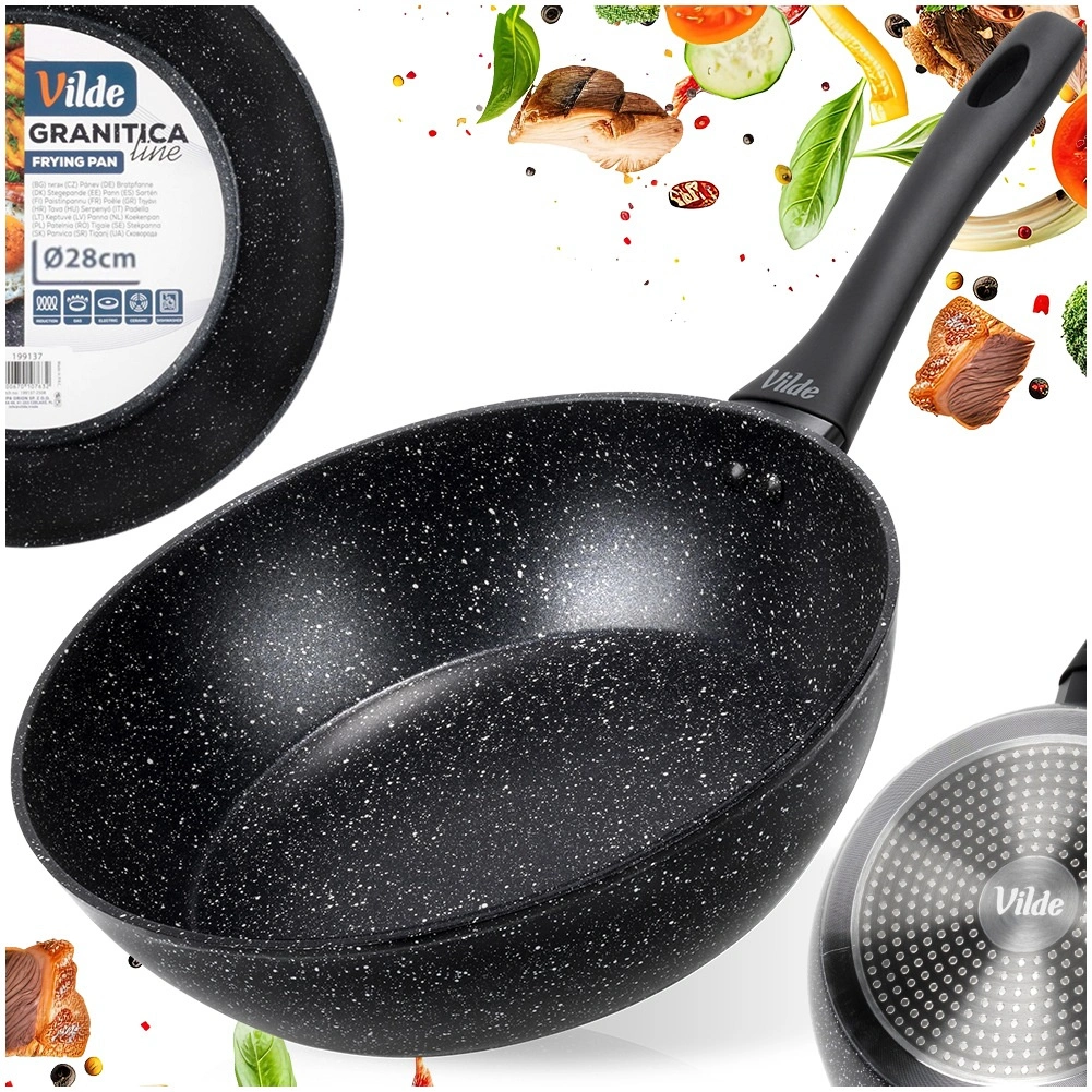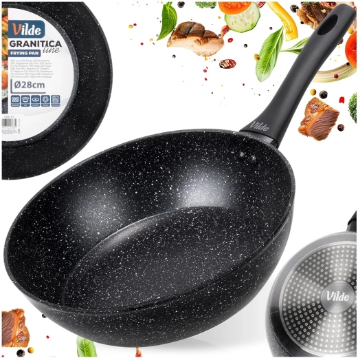 - Diametru 28 cm, înălțimea tigăii 7,5 cm – suficient spațiu pentru porții de familie.