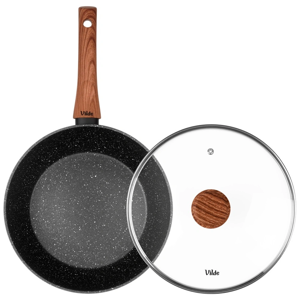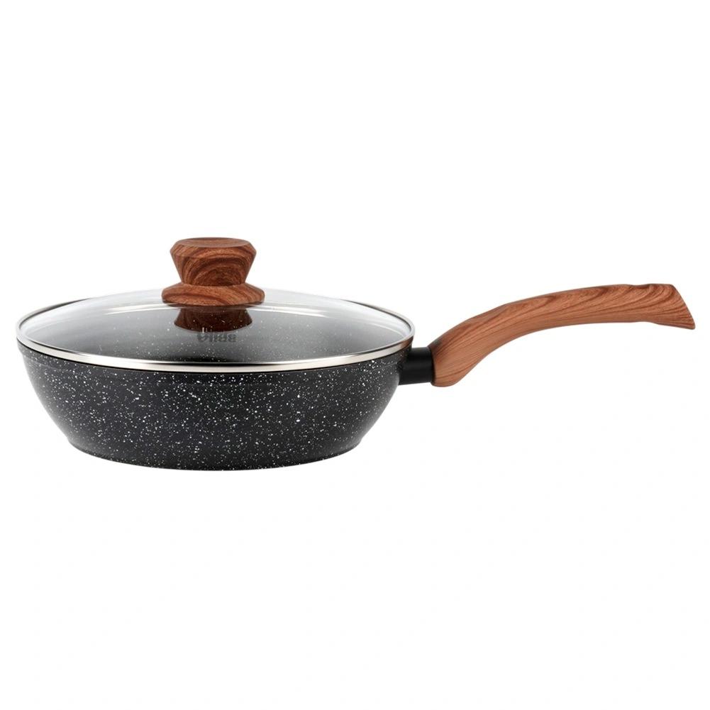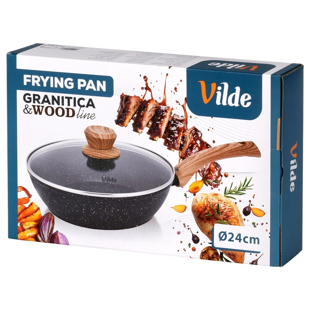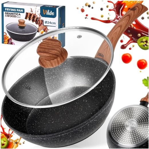 Tigaia adâncă GRANITICA WOOD 24 cm combină corpul rezistent din aluminiu cu suprafață antiaderentă din granit, multistrat, pentru o distribuție uniformă a căldurii și eliberarea ușoară a preparatelor. Capacul din sticlă cu margine din inox și supapă de abur ajută la păstrarea căldurii și a suculenței.