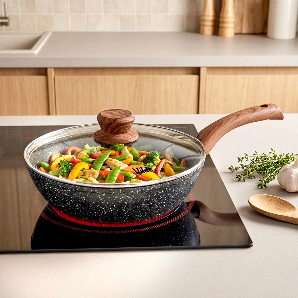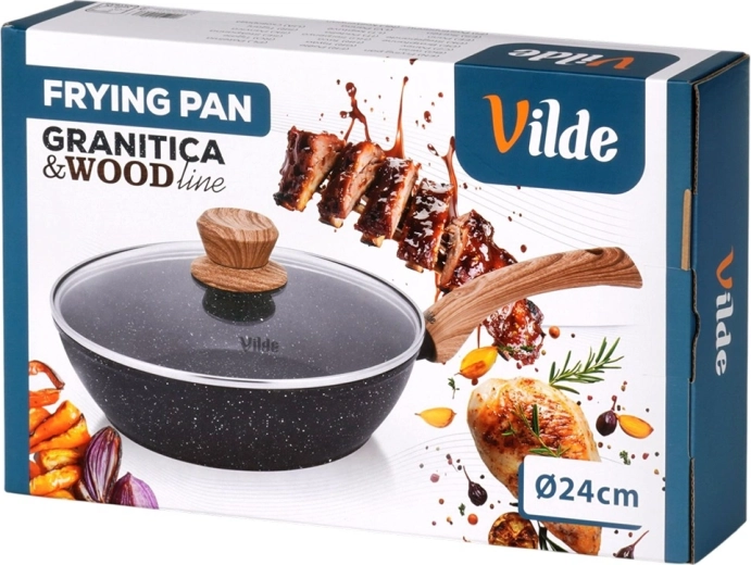 Tigaie practică și stilată din granit, cu diametrul de 24 cm și capac din sticlă, pentru gătit zilnic. Datorită suprafeței antiaderente din granit gătești cu minimum de grăsime, iar forma mai adâncă este ideală pentru prăjire, înăbușire și mâncăruri la oală unică. Mânerul ergonomic cu suprafață wood-look soft touch se așază plăcut în mână, iar capacul din sticlă termorezistentă cu orificiu de evacuare a aburului îți permite să ții gătitul mereu sub control. Potrivită pentru inducție, gaz, electric și ceramică și se poate spăla în mașina de spălat vase.