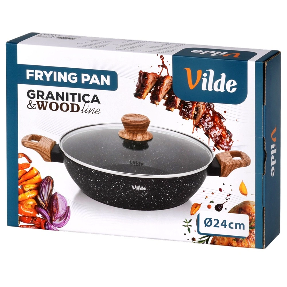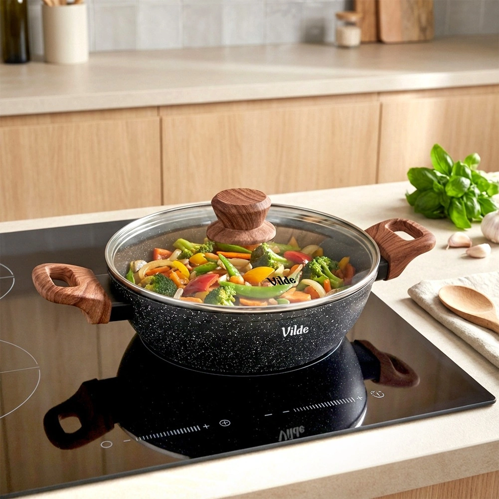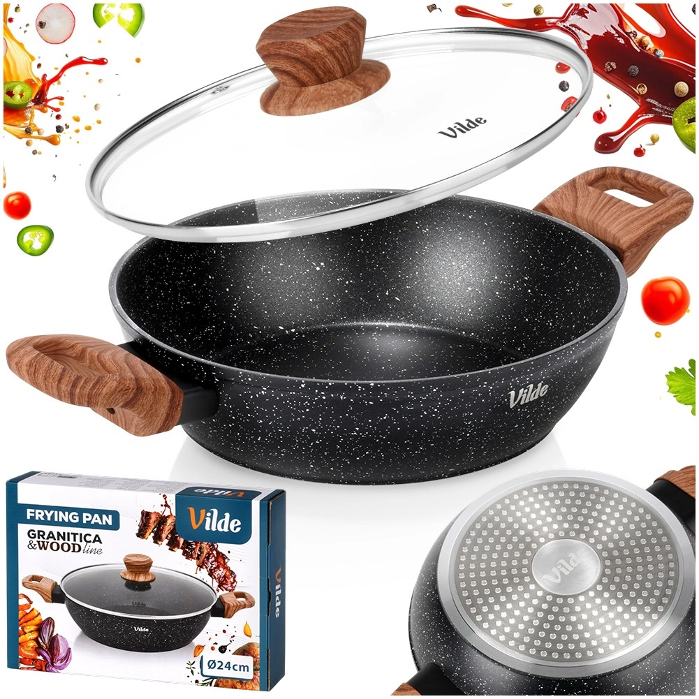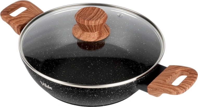 Tigaie adâncă practică, cu volum de 2,2 l, cu capac de sticlă pentru gătitul zilnic. Datorită stratului antiaderent din granit, distribuției uniforme a căldurii și mânerelelor soft touch cu decor de lemn, pregătiți cu ușurință mâncăruri prăjite, înăbușite și gratinate cu minimum de grăsime. Capacul din sticlă termorezistentă cu supapă de abur permite controlul comod al gătitului. Potrivită pentru inducție, gaz, electric și ceramic și se poate spăla în mașina de spălat vase.