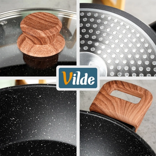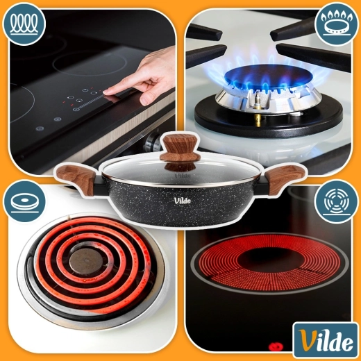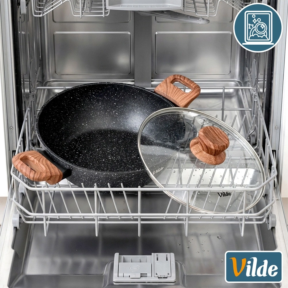 Mânerele ergonomice soft touch cu decor de lemn oferă o prindere sigură și confortabilă la transport. Tigaia este compatibilă cu toate tipurile de plite, inclusiv inducție, iar pentru o întreținere ușoară se poate spăla în mașina de spălat vase.