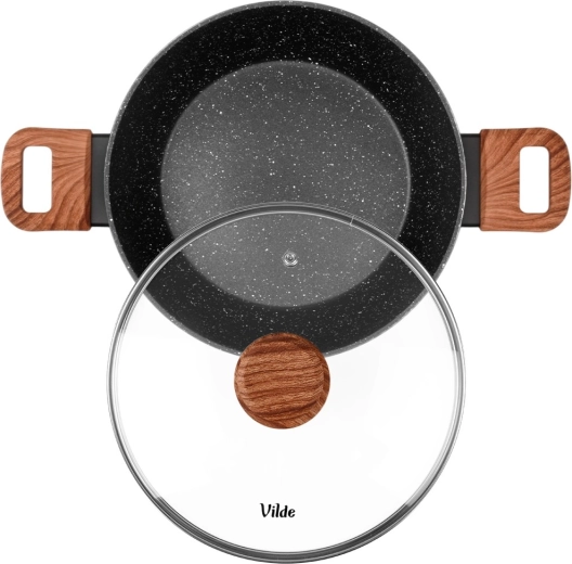 Două mânere laterale cu suprafață plăcută asigură o prindere sigură și stabilă la manipulare. Aspectul stilat, cu imitație de lemn, completează perfect bucătăria modernă.