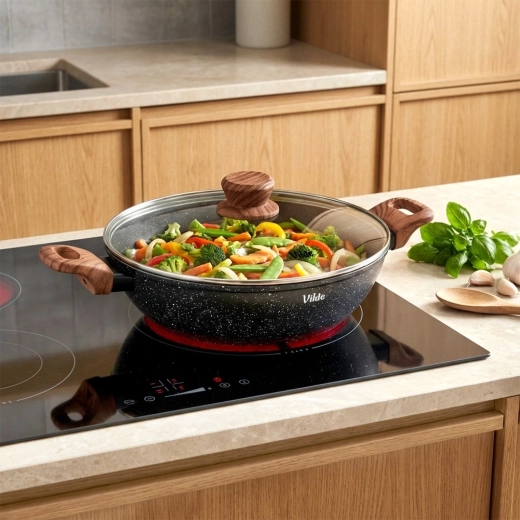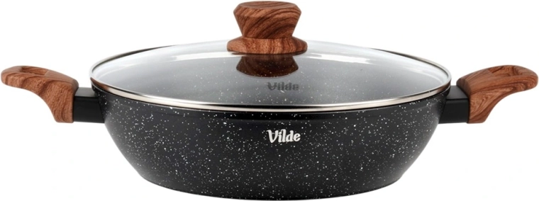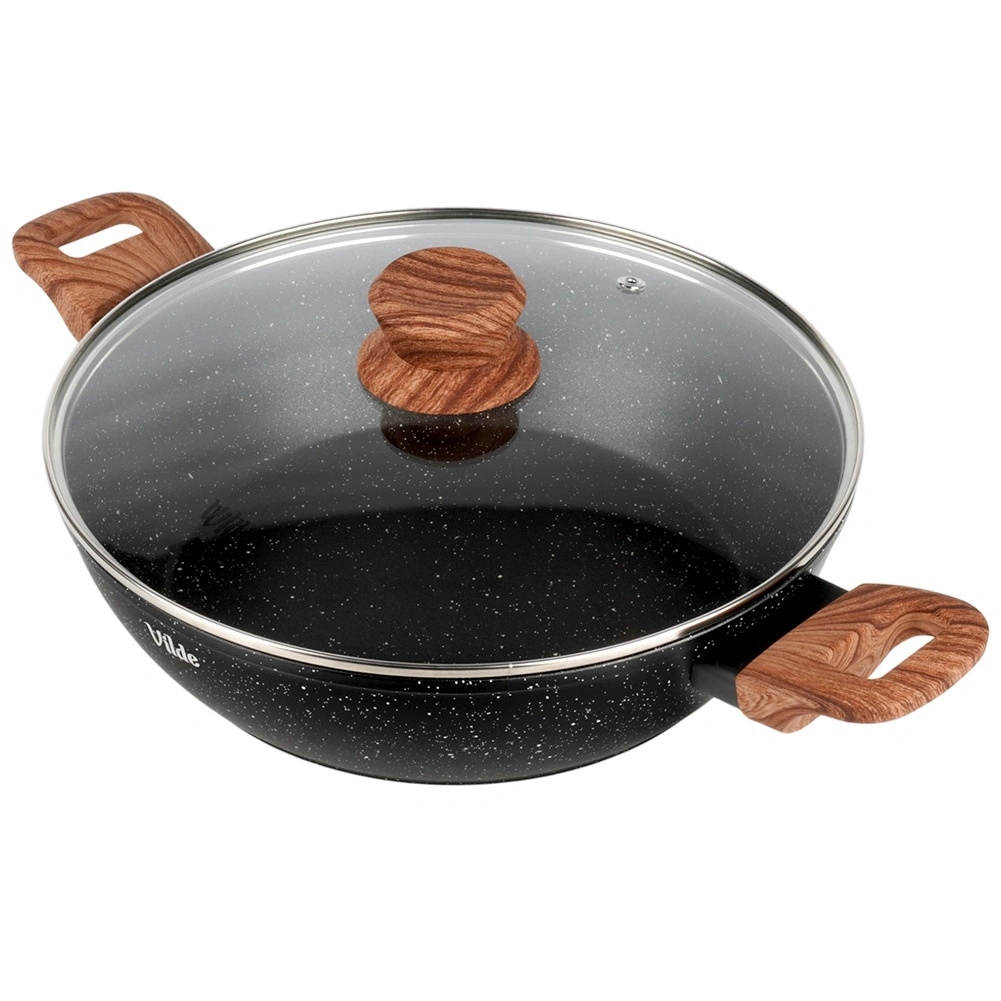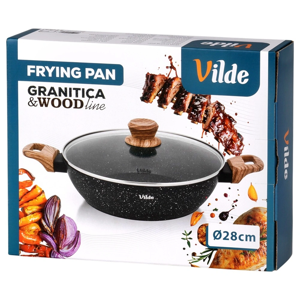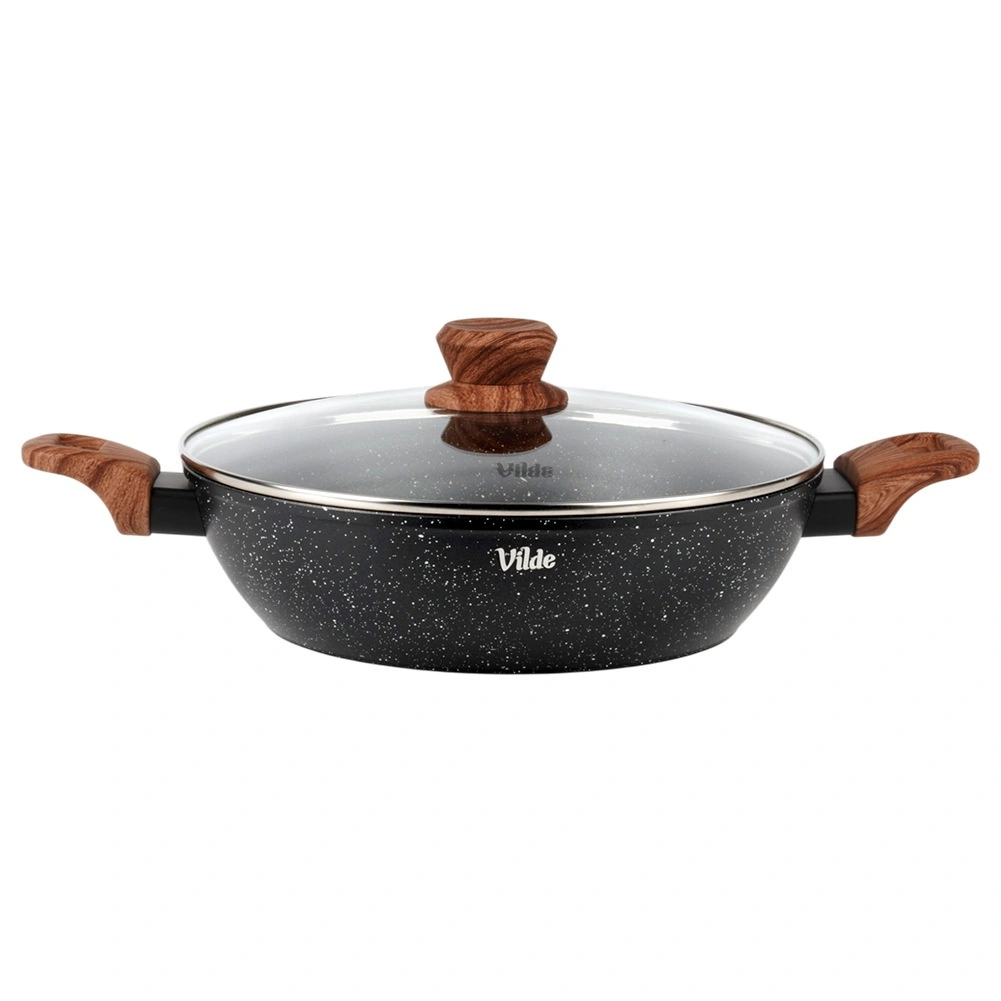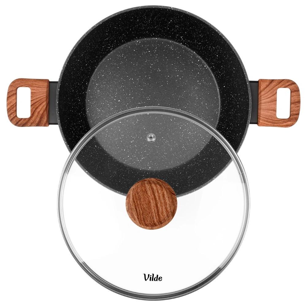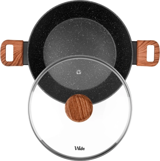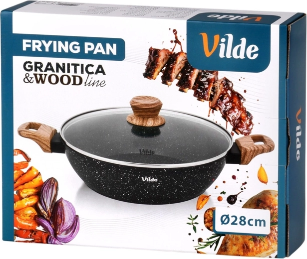 Tigaia adâncă Vilde din linia Granitica Wood este un ajutor versatil pentru prăjire, înăbușire și gratinare. Corpul din aluminiu turnat, durabil, cu strat antiaderent din granit asigură distribuție uniformă a căldurii și eliberarea ușoară a ingredientelor fără lipire. Capacul transparent din sticlă, cu ventil pentru abur, permite controlul gătitului fără a ridica capacul.