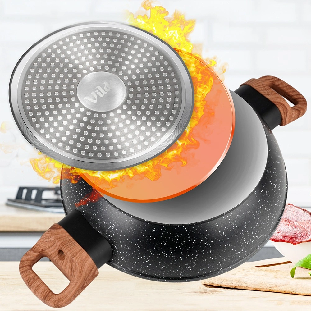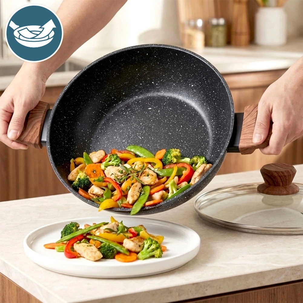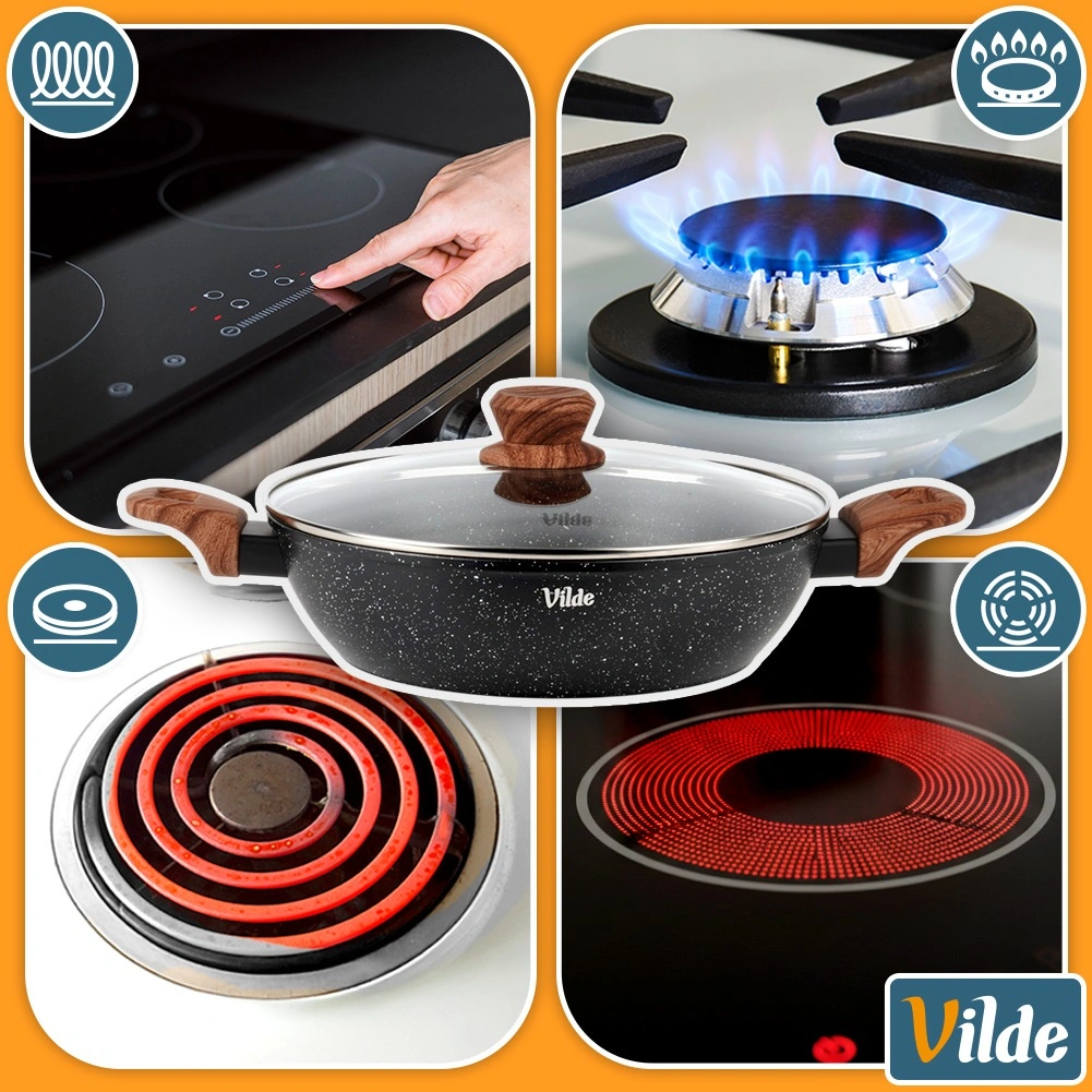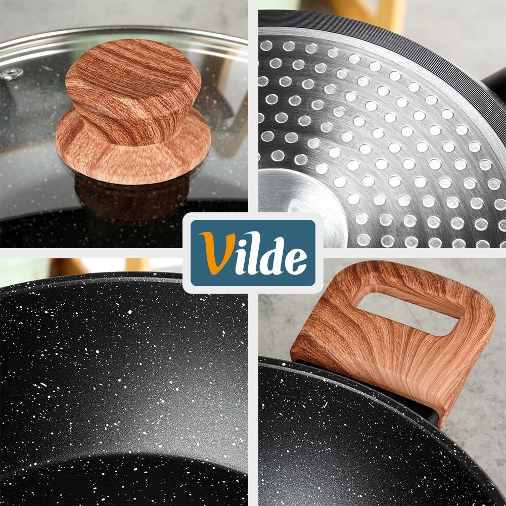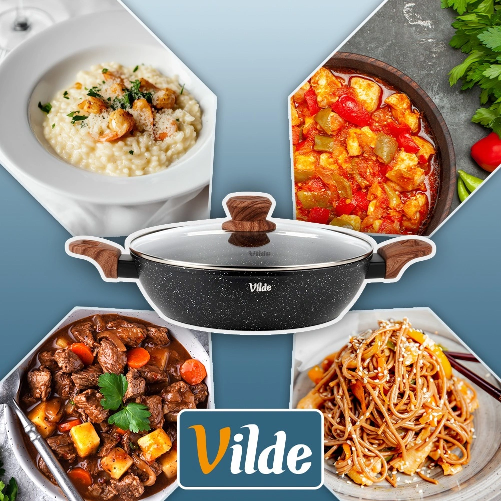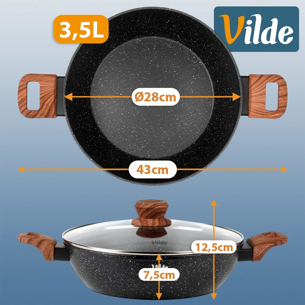 Tigaia adâncă Vilde din linia Granitica Wood este un ajutor versatil pentru prăjire, înăbușire și gratinare. Corpul din aluminiu turnat, durabil, cu strat antiaderent din granit asigură distribuție uniformă a căldurii și eliberarea ușoară a ingredientelor fără lipire. Capacul transparent din sticlă, cu ventil pentru abur, permite controlul gătitului fără a ridica capacul.