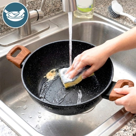 Stratificarea multiplă din granit minimizează necesarul de grăsime, ușurează curățarea și previne lipirea chiar și la temperaturi mai ridicate.