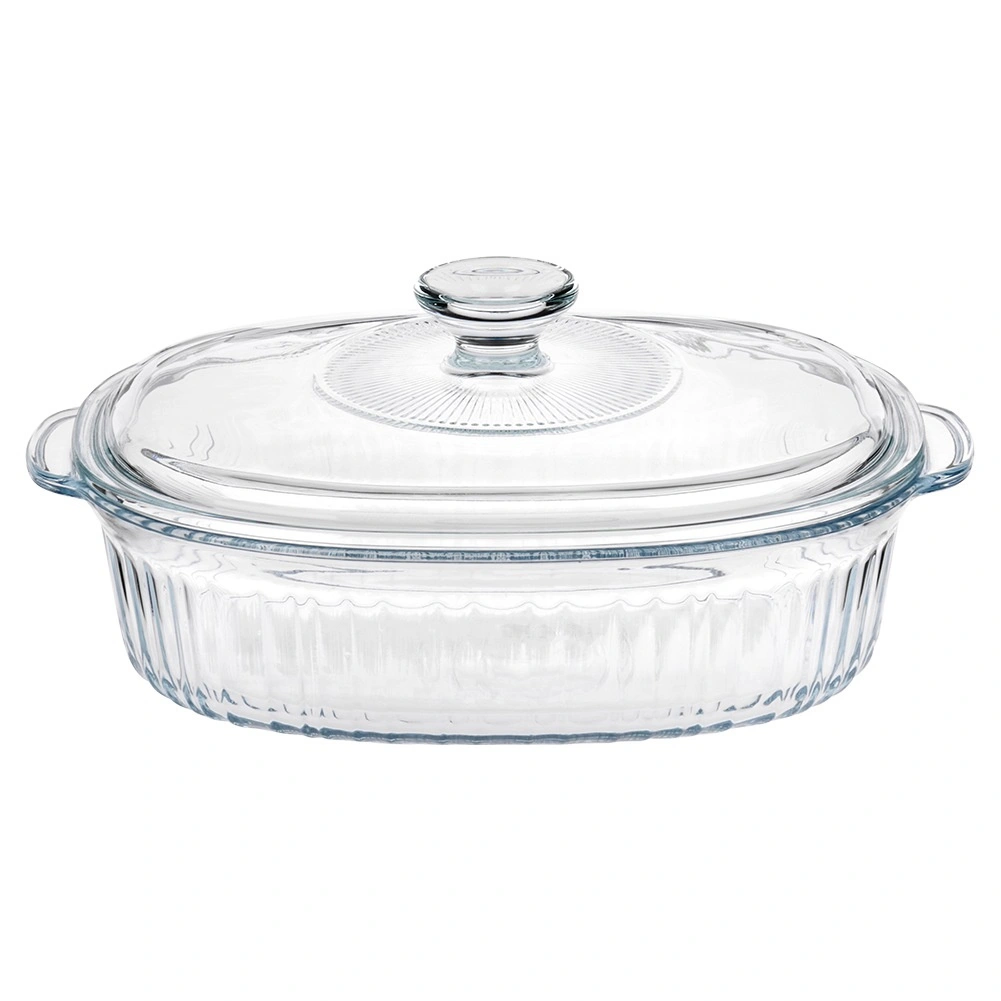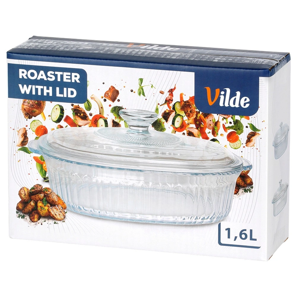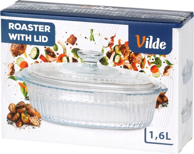 Vas practic din sticlă cu capac, cu volum de 1,6 l, din sticlă borosilicată rezistentă. Potrivit pentru cuptor, microunde, mașină de spălat vase și congelator, cu mânere ergonomice pentru transport sigur și capac care previne uscarea preparatelor.