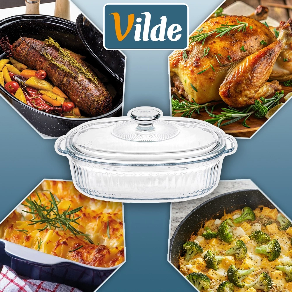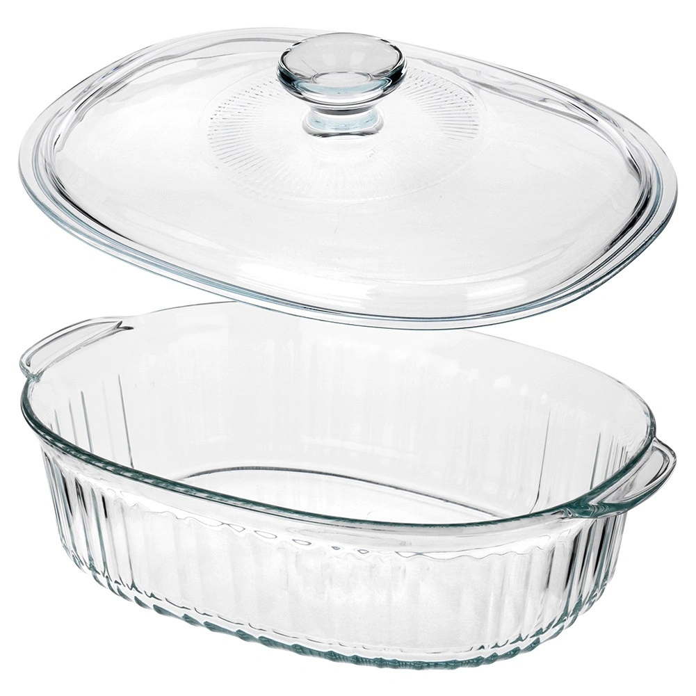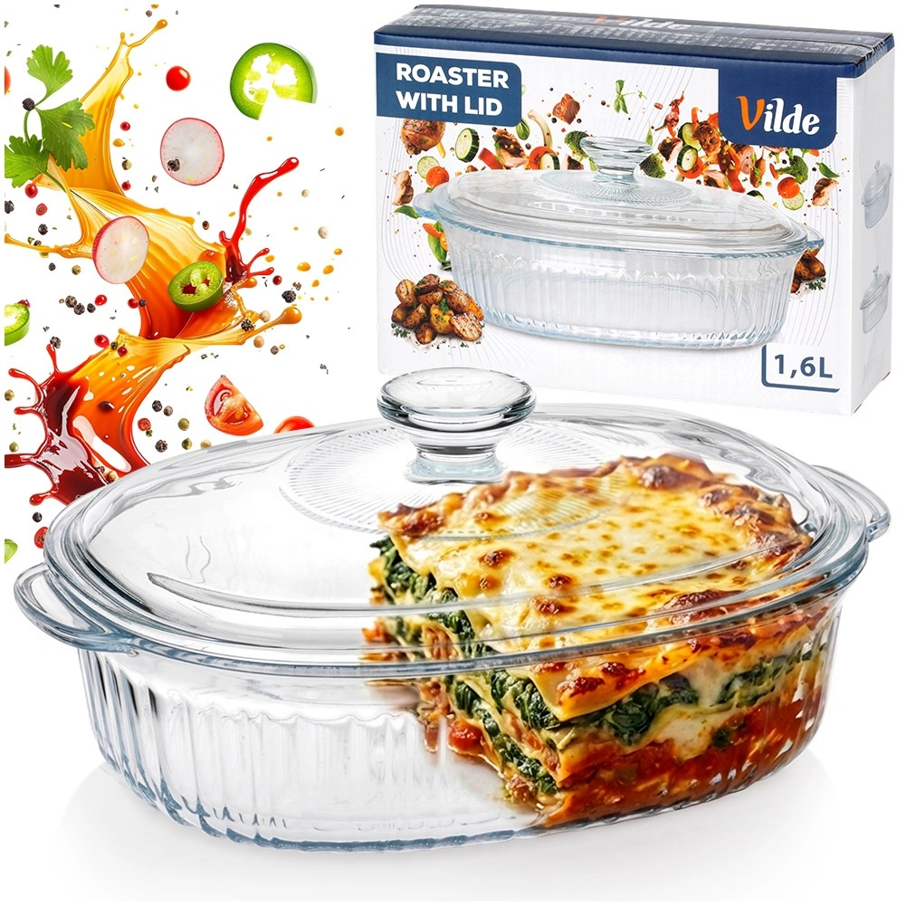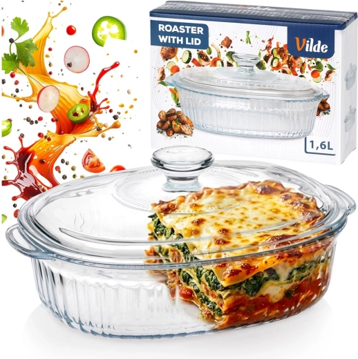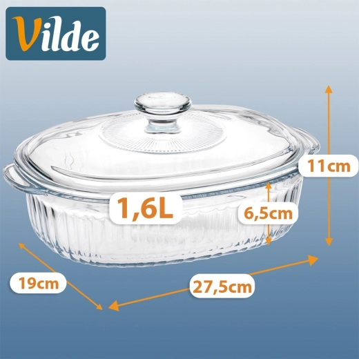Dimensiuni cu capac: 27,5 × 19 × 11 cm, înălțimea vasului fără capac: 6,5 cm, volum: 1,6 l. Sticla este rezistentă în intervalul -30 °C până la +400 °C, fiind potrivită pentru cuptor, microunde, frigider și congelator. Capacul ajută la menținerea umidității și a căldurii, iar mânerele facilitează manipularea.