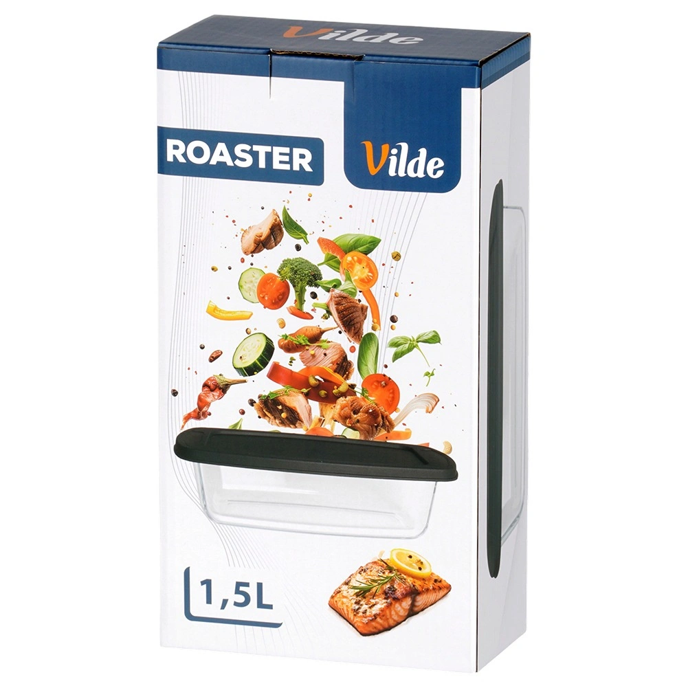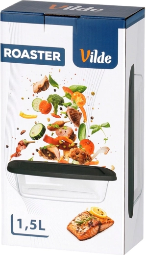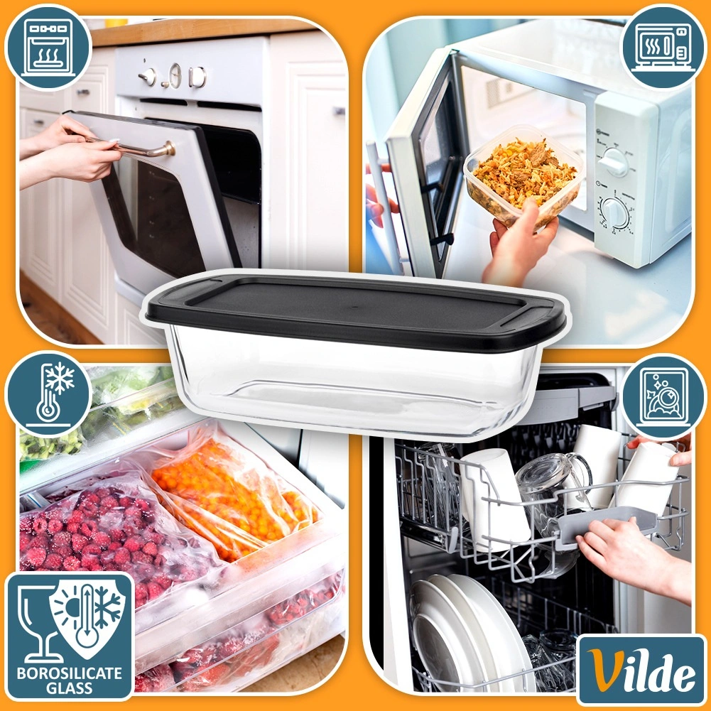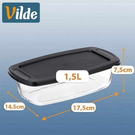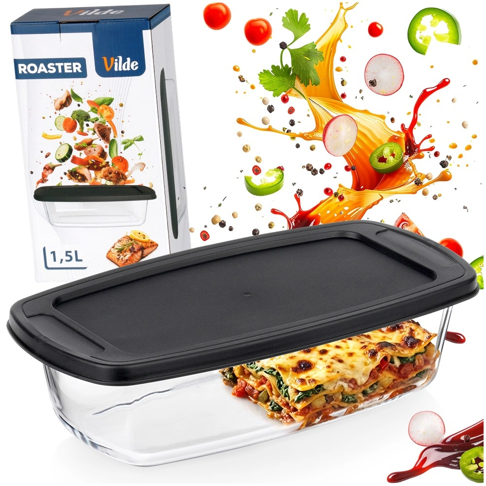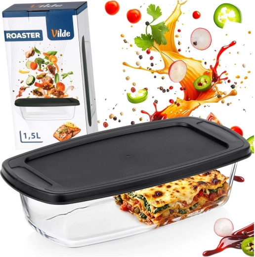 Vas universal din sticlă cu volum de 1,5 l, cu capac negru practic, ideal pentru coacere, gratinare și depozitare a mâncărurilor. Sticla borosilicată rezistentă suportă temperaturi de la -30 °C la +400 °C (capac de la -18 °C la 120 °C), fiind excelentă pentru cuptor, cuptor cu microunde, frigider și congelator. Mânerele integrate facilitează manipularea, iar capacul etanș ajută la menținerea prospețimii alimentelor pentru mai mult timp.