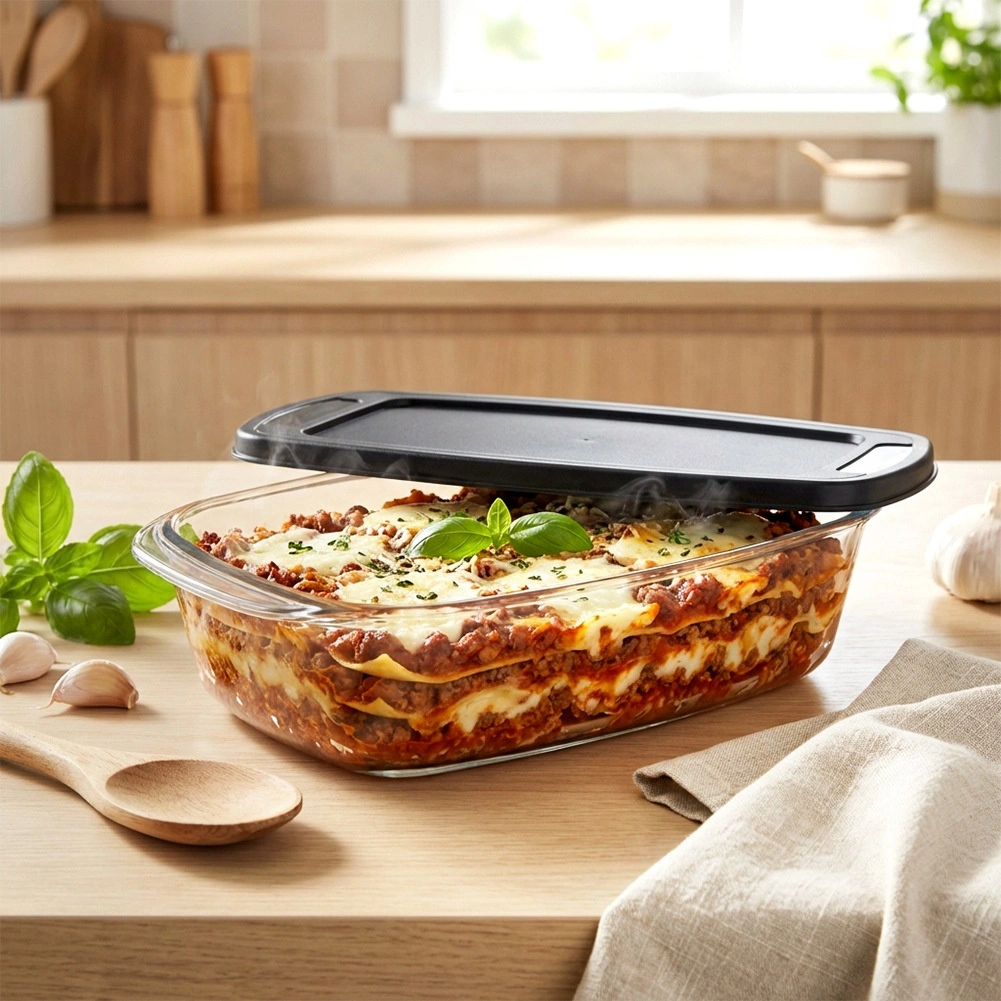 Potrivit pentru lasagna, cartofi gratinați, carne, legume, dar și pentru coacerea pâinii, checului sau a pateului. Capacul protejează mâncarea împotriva uscării și permite transportul și depozitarea în siguranță, fără vărsare.