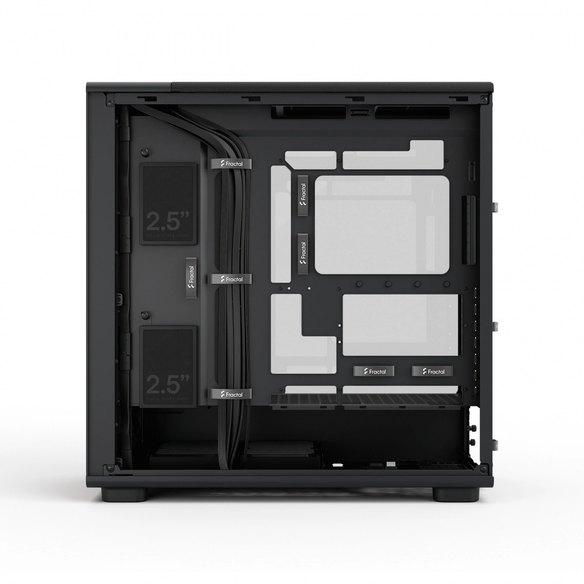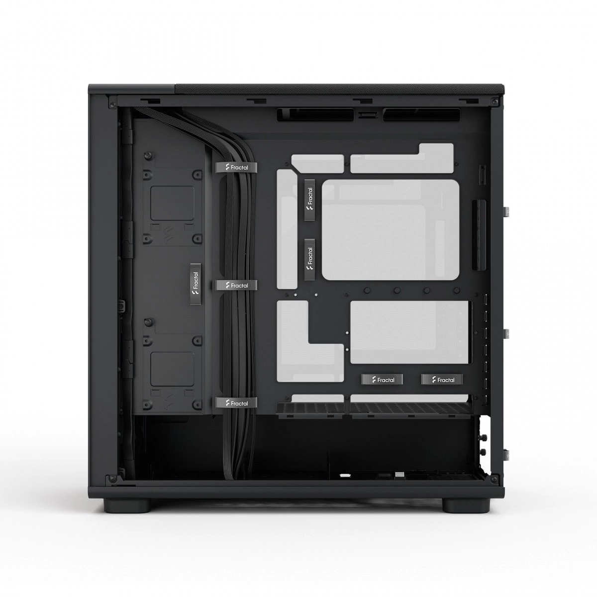 Canale largi pentru cabluri, benzi velcro și suficient spațiu pentru instalarea ordonată a unităților, sursei și GPU-urilor lungi.