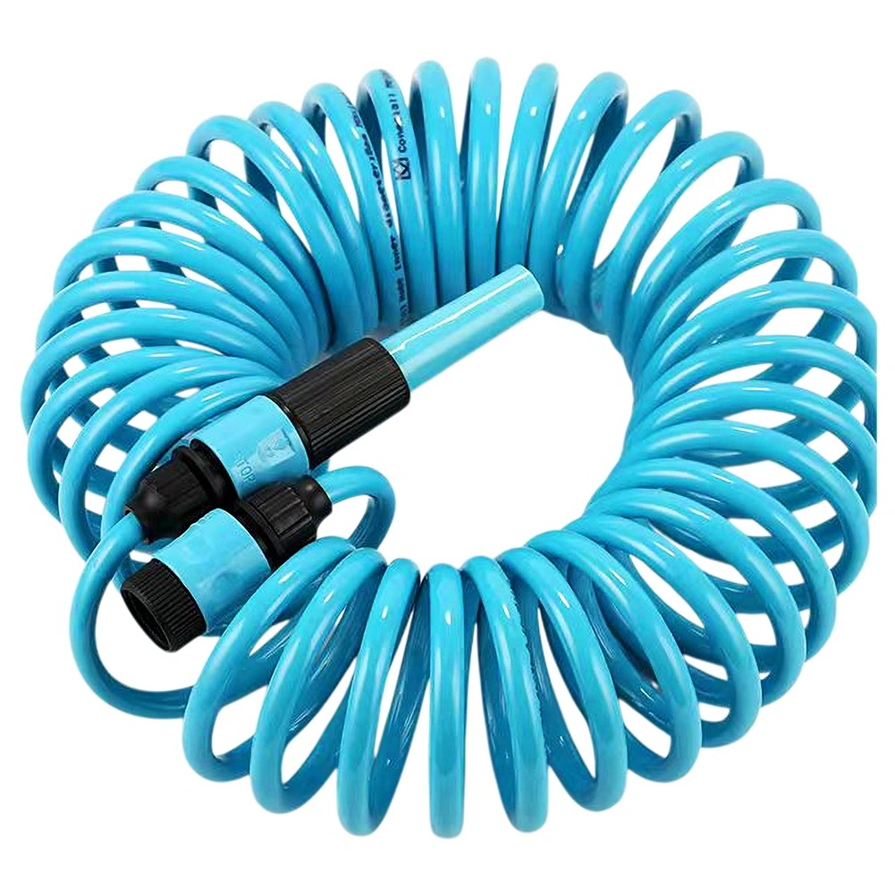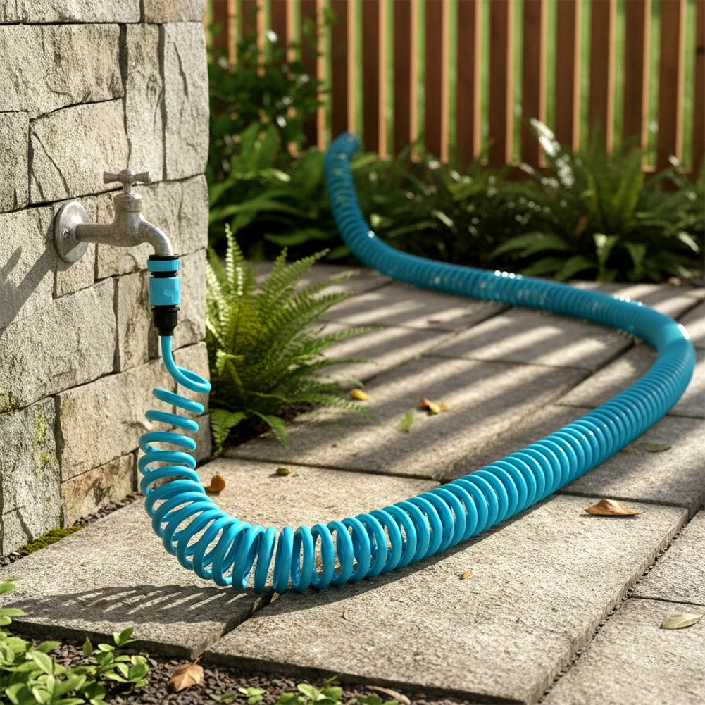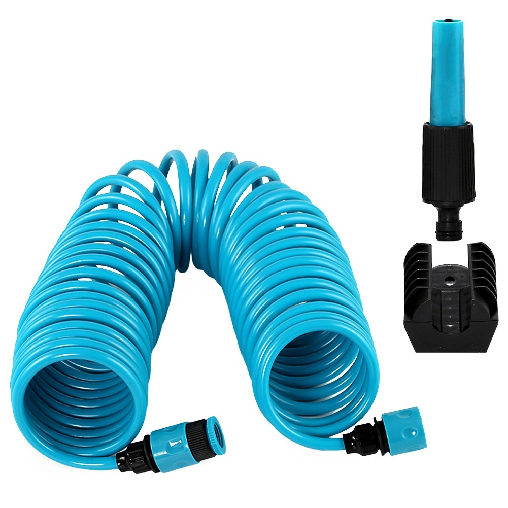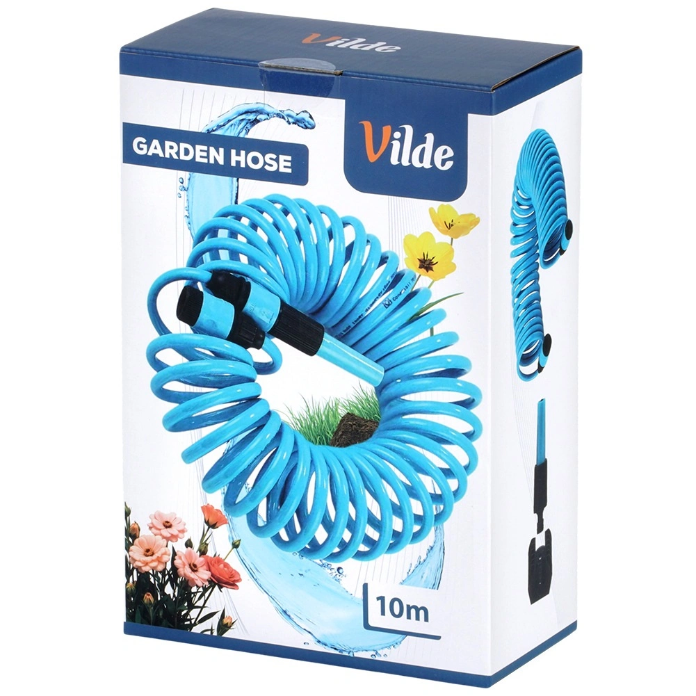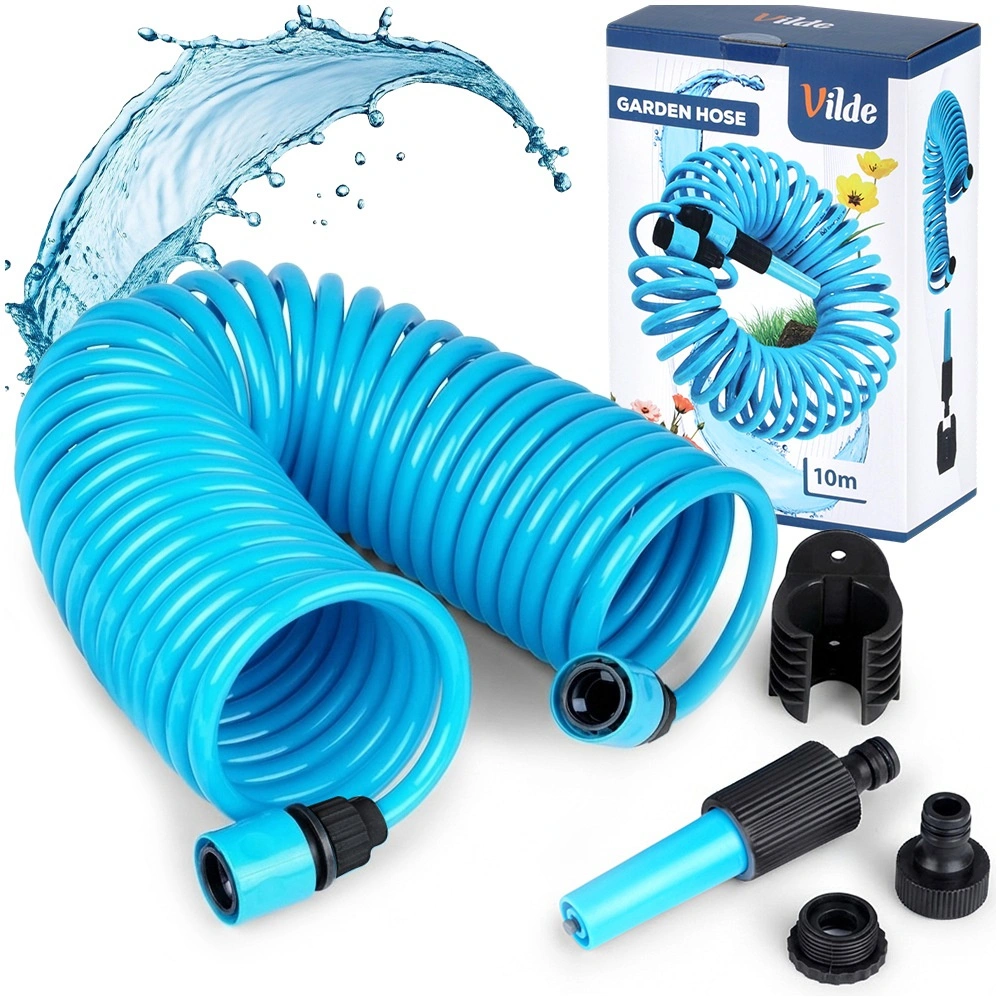 Furtun de grădină spiral, lungime 10 m, cu design auto-retractabil care economisește spațiu și ușurează munca. Include pistol de stropit, conectori rapizi și suport de perete. Furtunul este ușor flexibil, rezistent și, după eliberare, se strânge automat, astfel încât nu se încurcă și nu necesită înfășurare manuală.