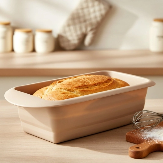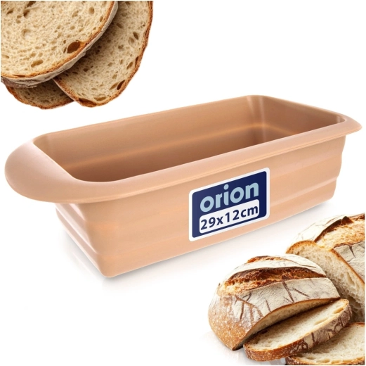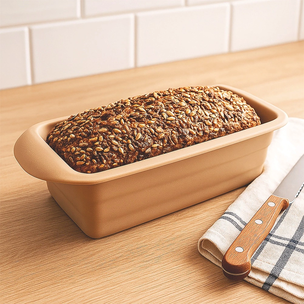 Forma practică din silicon pentru pâine și chec, cu dimensiunile 29 × 12 × 6,5 cm, asigură coacere uniformă, răsturnare ușoară fără lipire și durată lungă de viață. Rezistă la temperaturi de la -40 °C la +220 °C, este potrivită pentru cuptor, cuptor cu microunde, frigider și congelator și se poate spăla în mașina de spălat vase.