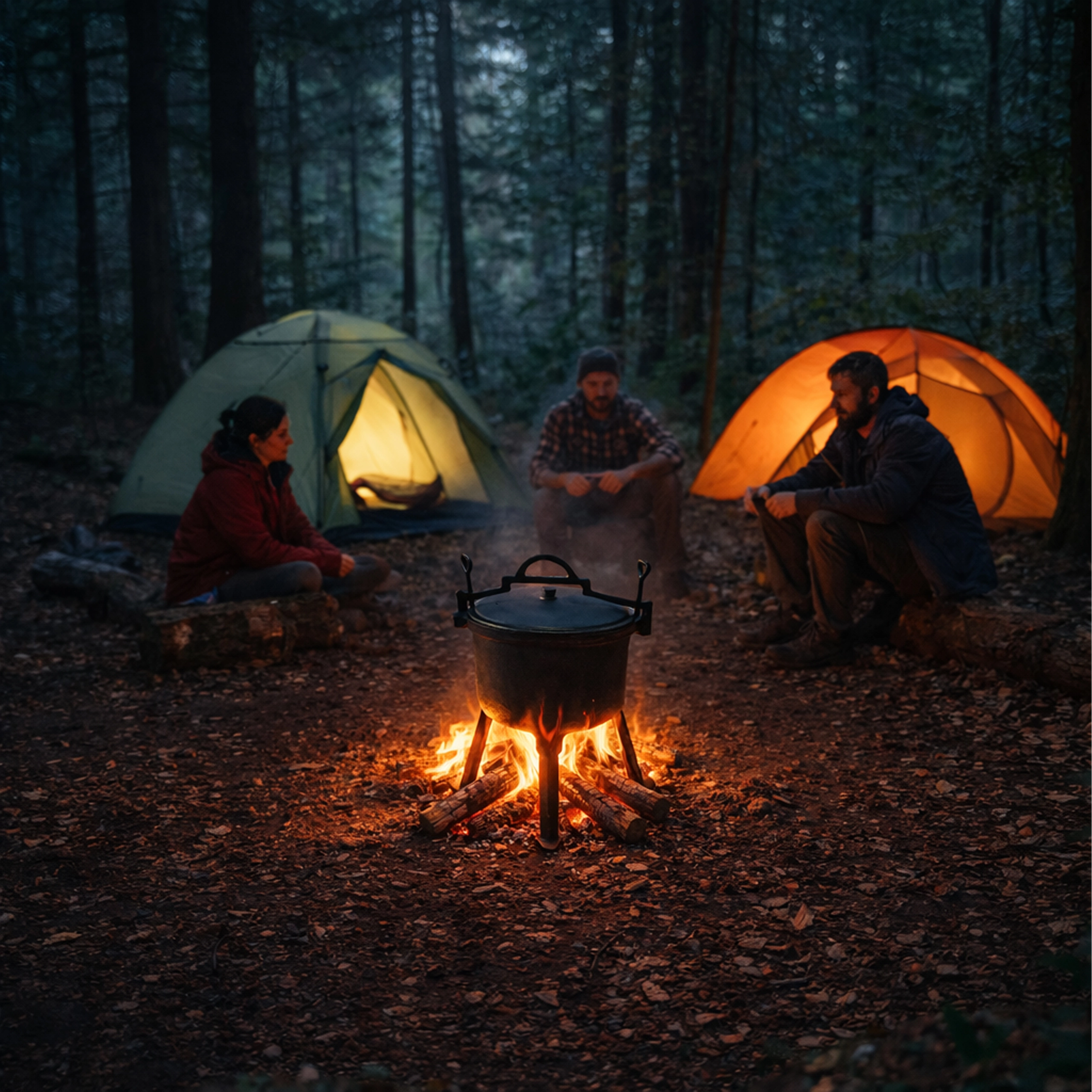 Cele trei picioare integrate asigură o poziție fermă a ceaunului deasupra vetrei – fără stative sau cârlige complicate. Gătit în aer liber sigur și confortabil oriunde.