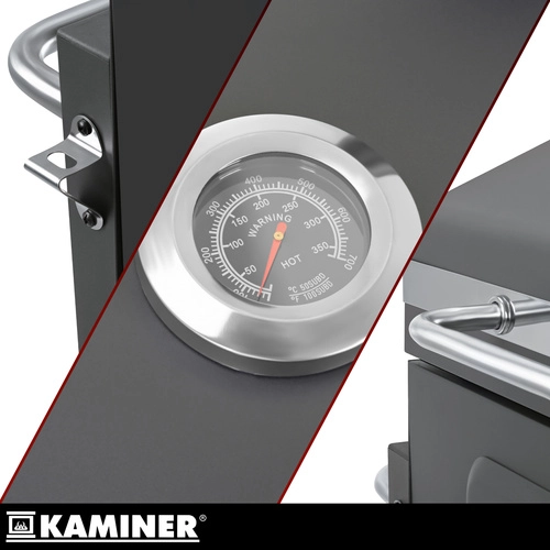 Descoperiți grătarul cu cărbuni KAMINER, care datorită tablei groase (1 mm) păstrează căldura mai mult și nu se deformează. Grătarul din fontă în 3 piese (email) oferă sprijin sigur pentru carne, iar deschiderea centrală ușurează operarea și curățarea. Capacul cu termometru integrat și sistemul de fante de aer cu coș permit controlul precis al temperaturii fără a ridica inutil capacul.