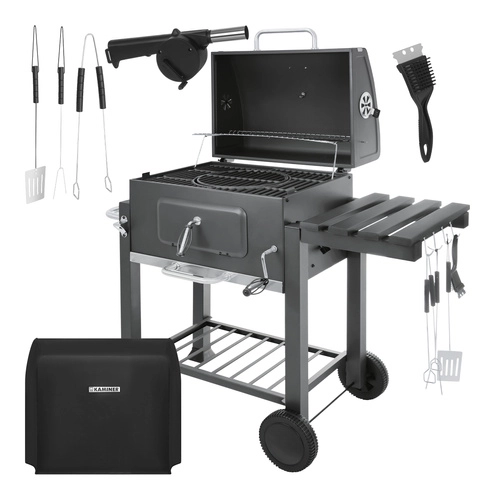 - Carcasă cu capac și termometru, vatră reglabilă pe înălțime cu cuvă din inox pentru cărbuni, grătar din fontă (3 piese), grătar superior cromat, tavă de cenușă culisantă, măsuță laterală, poliță inferioară, deschizător de sticle, husă de protecție, set 3 unelte BBQ, foale manuale, perie de curățare, șuruburi de montaj, manual multilingv