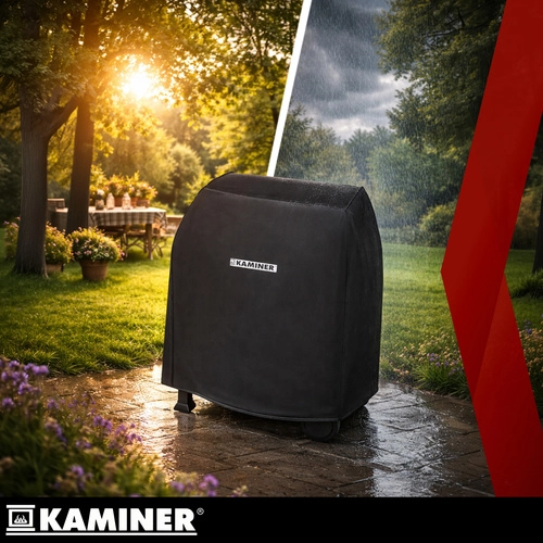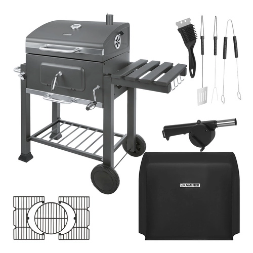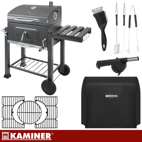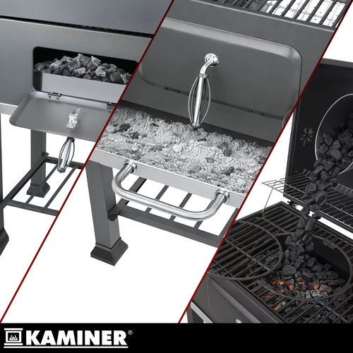 Grătar de grădină robust KAMINER pentru gătit exigent: grătar din fontă emailată, în 3 piese cu deschidere centrală, capac cu termometru, reglare a înălțimii vetrei cu manivelă și cuvă din inox pentru cărbuni pentru temperatură stabilă și curățare ușoară. Pachetul este completat de grătar superior cromat – warm rack, măsuță laterală, tavă de cenușă și accesorii bogate, inclusiv husă de protecție.