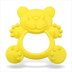 Jucărie de dentiție galbenă din silicon, cu inel ușor de prins, ideală pentru ros delicat și joacă.