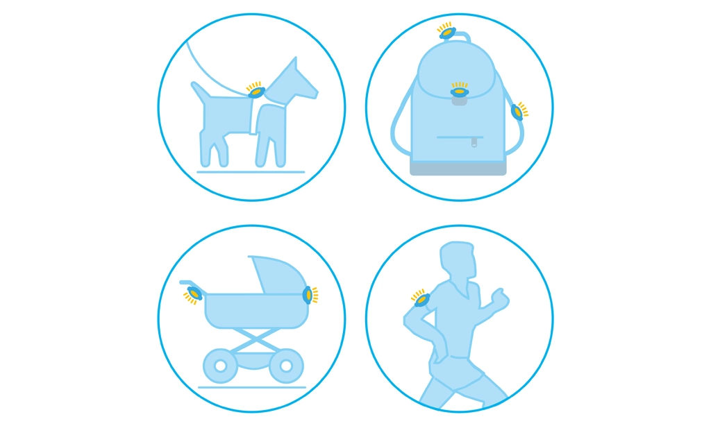 Prinde lumina de guler, rucsac, cărucior sau îmbrăcăminte sport și fii vizibil la alergare, mers pe jos sau pe drumul spre casă.