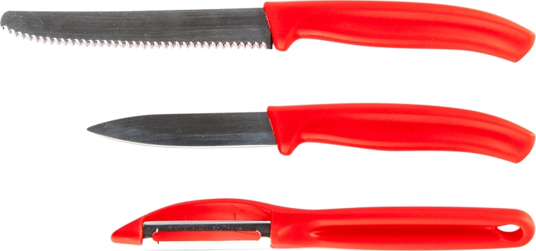 Datorită mânerelor ergonomice din plastic într-o nuanță atractivă de roșu, uneltele se țin bine în mână, iar munca este mai sigură și mai confortabilă. Setul este ideal pentru utilizare versatilă în gospodărie și completează perfect echiparea de bază a bucătăriei.