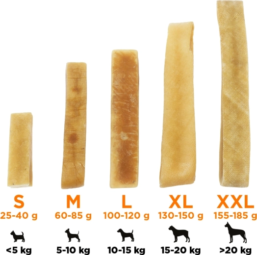 - S: 25–50 g (câini până la 5 kg); M: 51–85 g (5–10 kg); L: 86–120 g (10–15 kg); XL: 121–150 g (15–20 kg); XXL: 151–185 g (peste 20 kg)