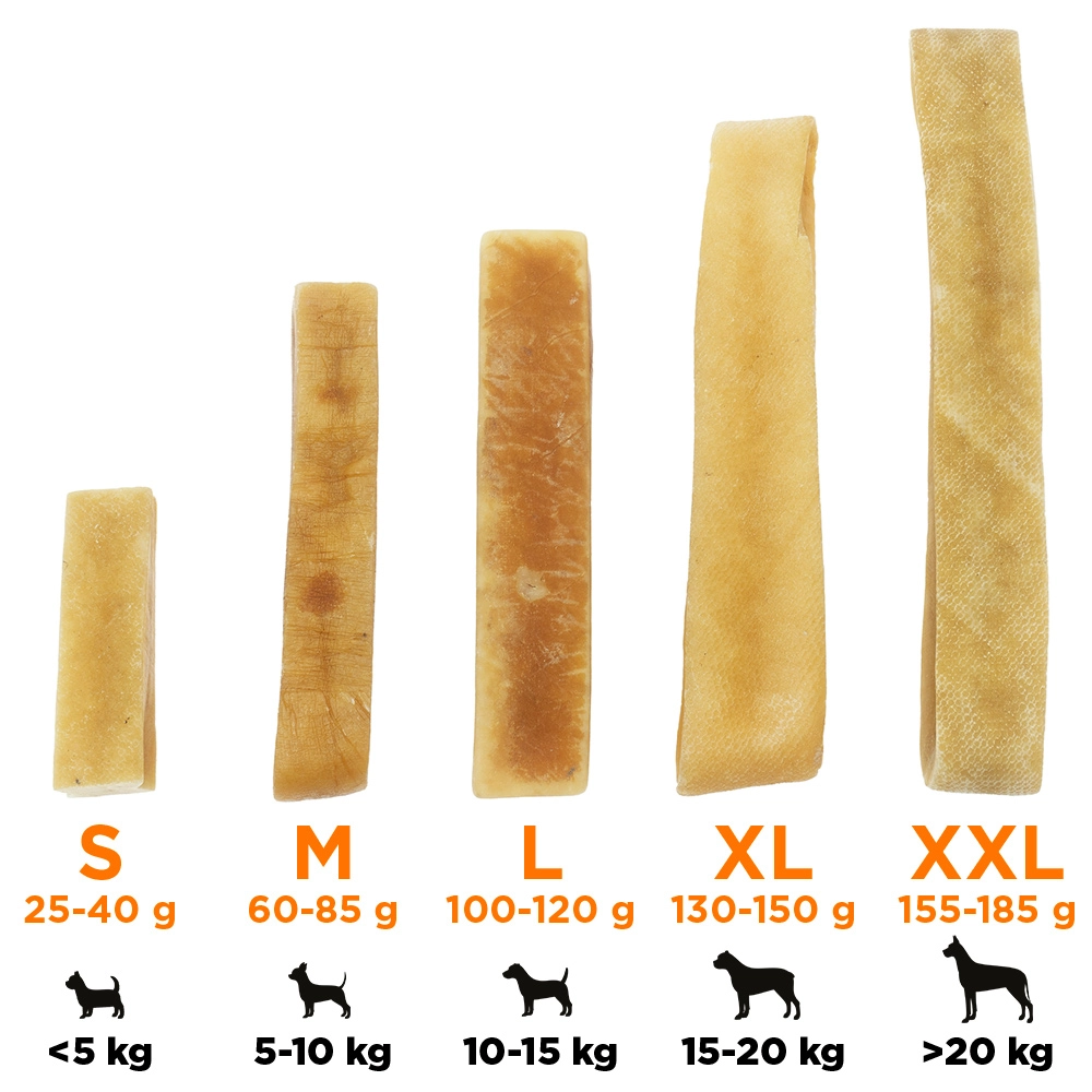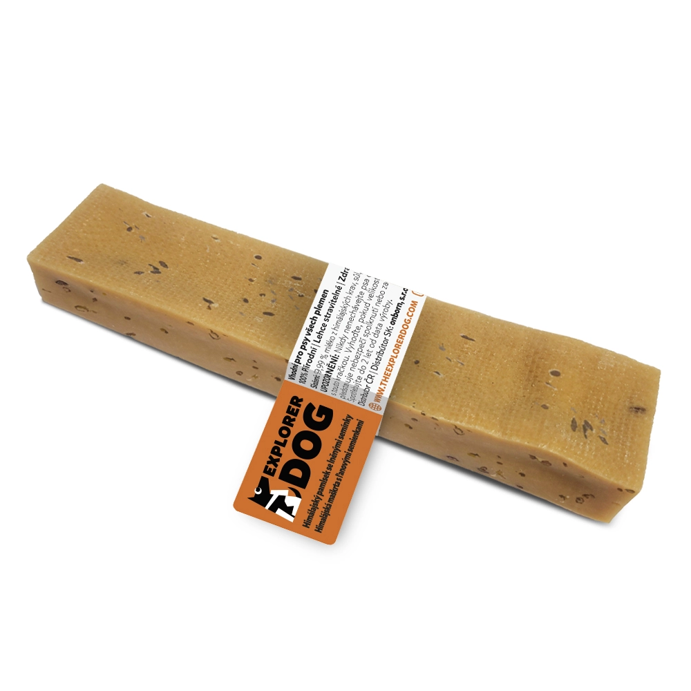 Batoanele XXL din brânză himalayană cu semințe de in sunt fabricate printr-o metodă tradițională: laptele este fiert îndelung pentru pasteurizare și îndepărtarea grăsimii, închegat cu un praf de sare și suc de limetă, apoi presat câteva zile și uscat/afumat 20–30 de zile. Rezultatul este o gustare extrem de dură și de lungă durată, care distrează câinele și susține în mod natural dinți curați și respirație proaspătă.
