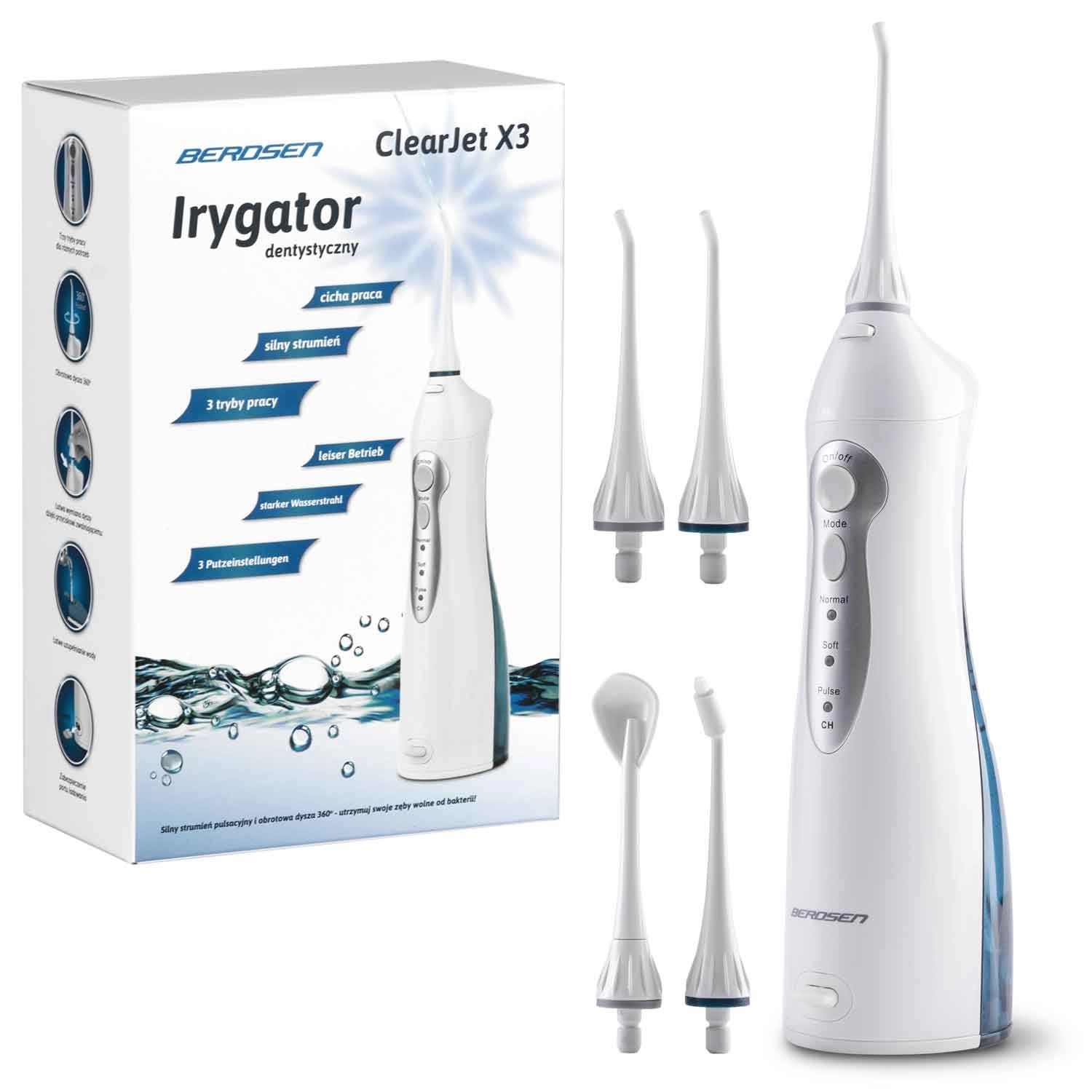Îngrijire profesională a cavității bucale oriunde și oricând. Irigatorul BERDSEN ClearJet X3 îndepărtează eficient placa, resturile alimentare și bacteriile din zonele unde periuța clasică nu ajunge. Este ideal pentru curățarea spațiilor interdentare, aparatelelor dentare, implanturilor și coroanelor. Trei moduri de funcționare vă permit să adaptați jetul de apă nevoilor dvs. – de la îngrijirea delicată pentru gingii sensibile până la masajul pulsat intens pentru prospețime maximă.