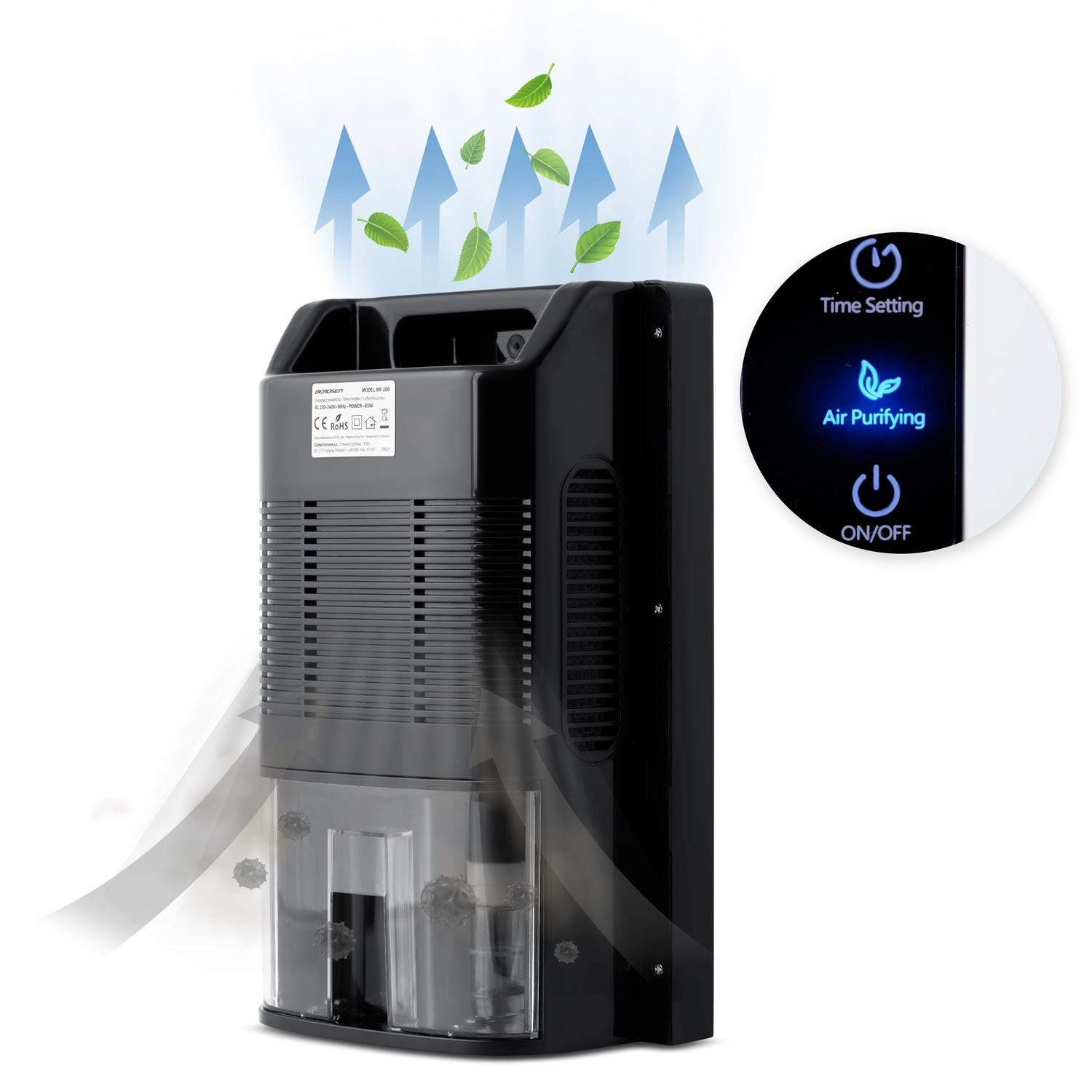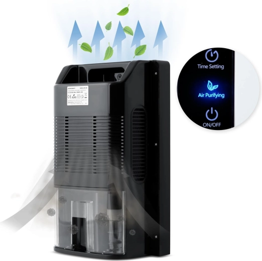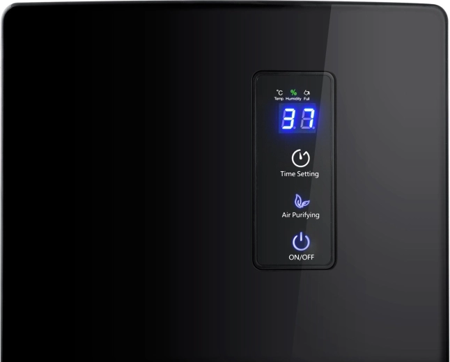 Tehnologia Peltier termo-electrică condensează fiabil umiditatea fără utilizarea de substanțe chimice. Panoul tactil LED clar afișează toate informațiile esențiale, iar temporizatorul 1–24 h facilitează programarea. Detectorul nivelului apei oprește automat dispozitivul când rezervorul (2 l) este plin și avertizează prin schimbarea culorii indicatorului.