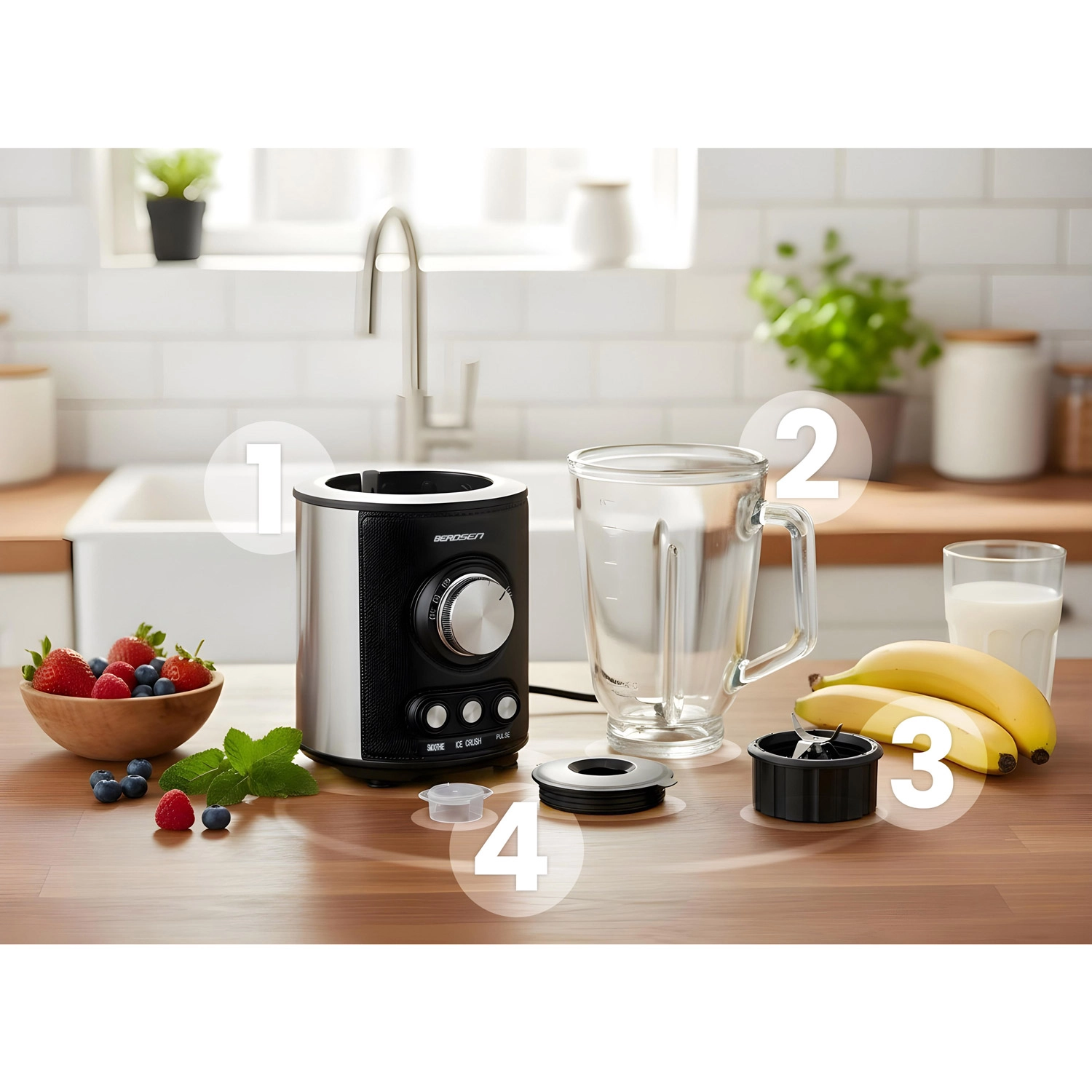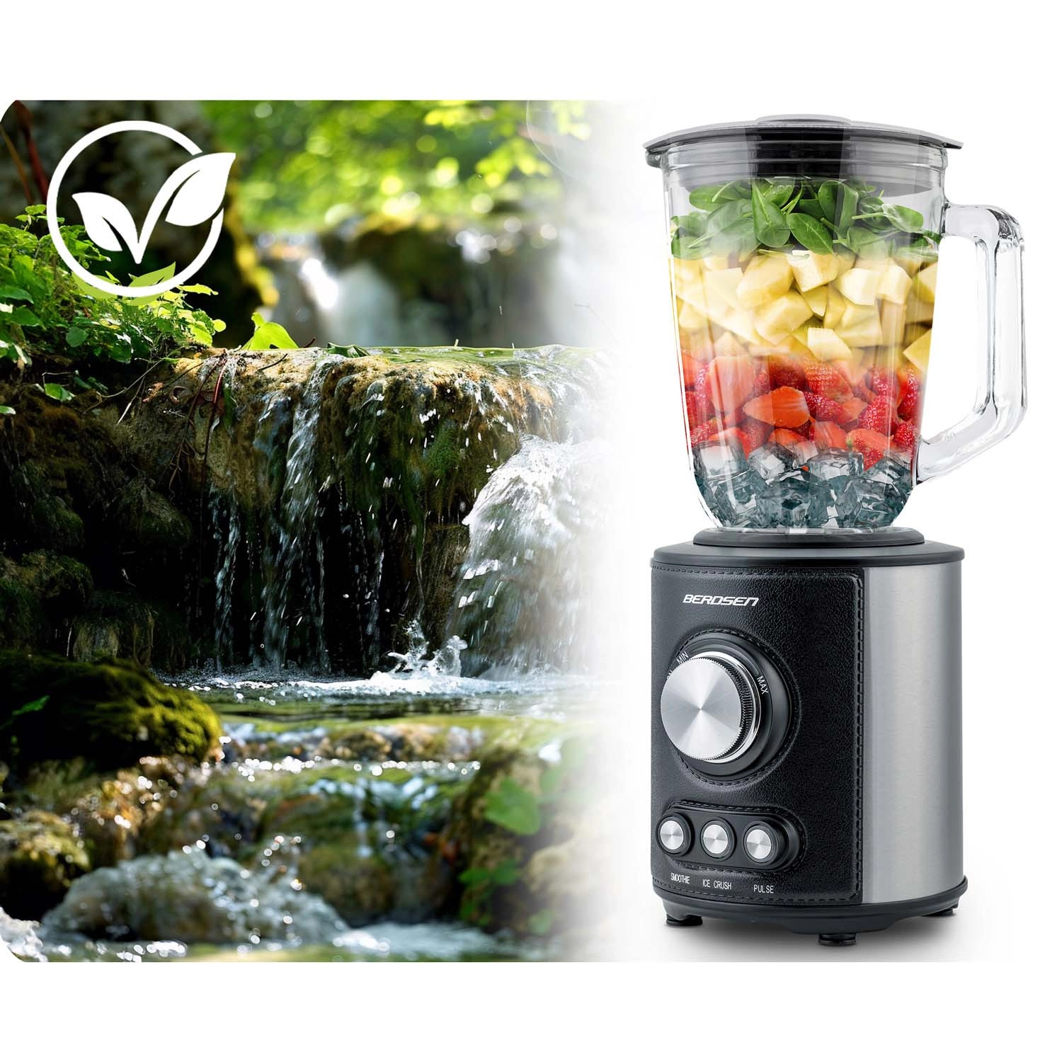 Blenderul BERDSEN este un ajutor de încredere pentru gătitul sănătos de zi cu zi. Motorul puternic de 800 W și lamele din oțel inoxidabil taie fără efort legume tari, nuci și cuburi de gheață. Cana din sticlă de 1,5 l este spațioasă, rezistentă, nu absoarbe mirosuri și se întreține ușor.