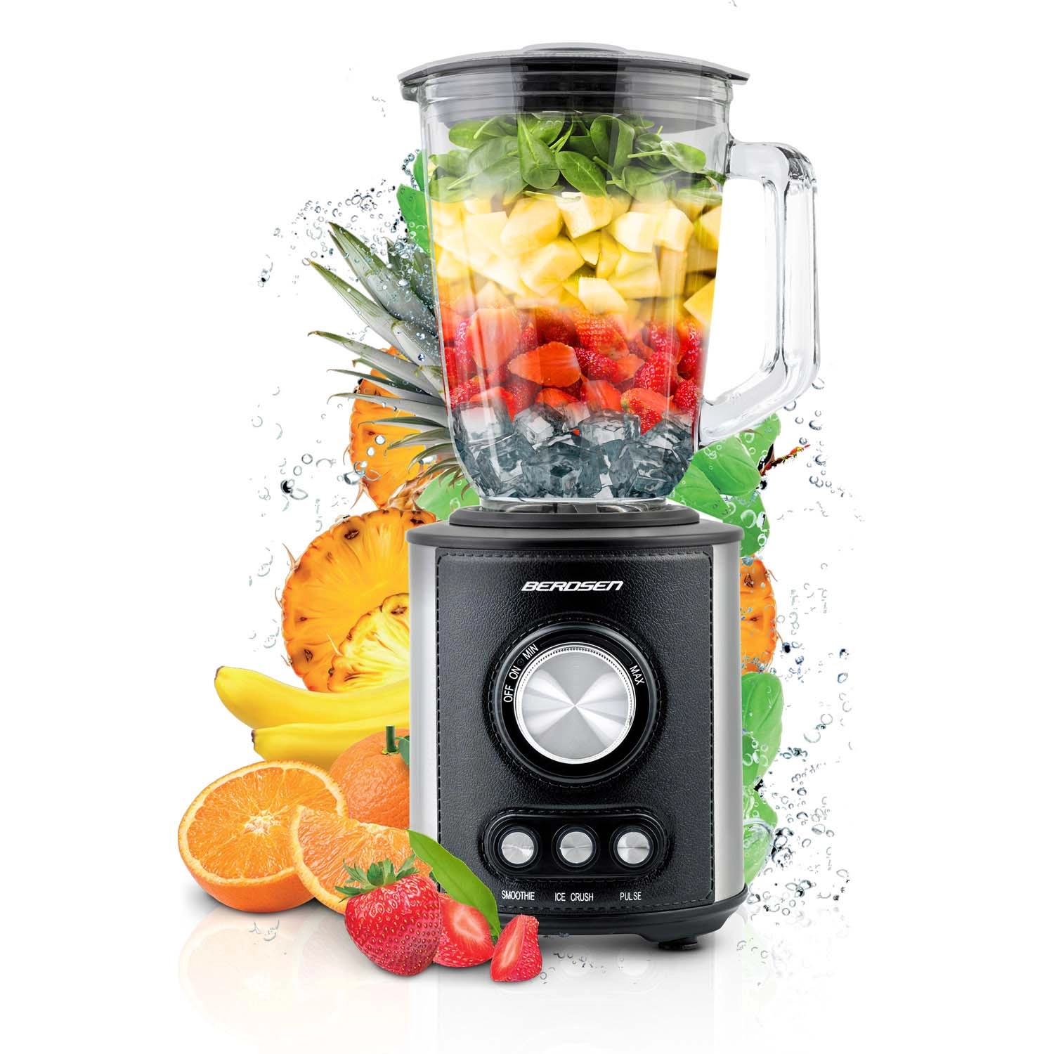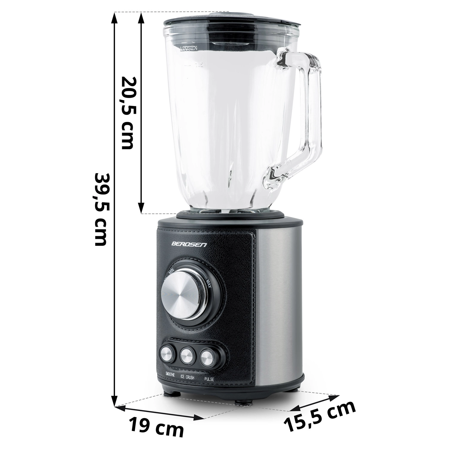 Blenderul de masă BERDSEN, puternic, cu capacitate de 1,5 l și motor de 800 W, face față smoothie-urilor, supelor și zdrobirii gheții. Are vas din sticlă, lame din oțel inoxidabil și 3 programe automate – Smoothie, Ice Crush și Pulse. Vei aprecia iluminarea de fundal a comenzilor, picioarele antiderapante, curățarea ușoară și siguranțele împotriva supraîncălzirii și asamblării incorecte.