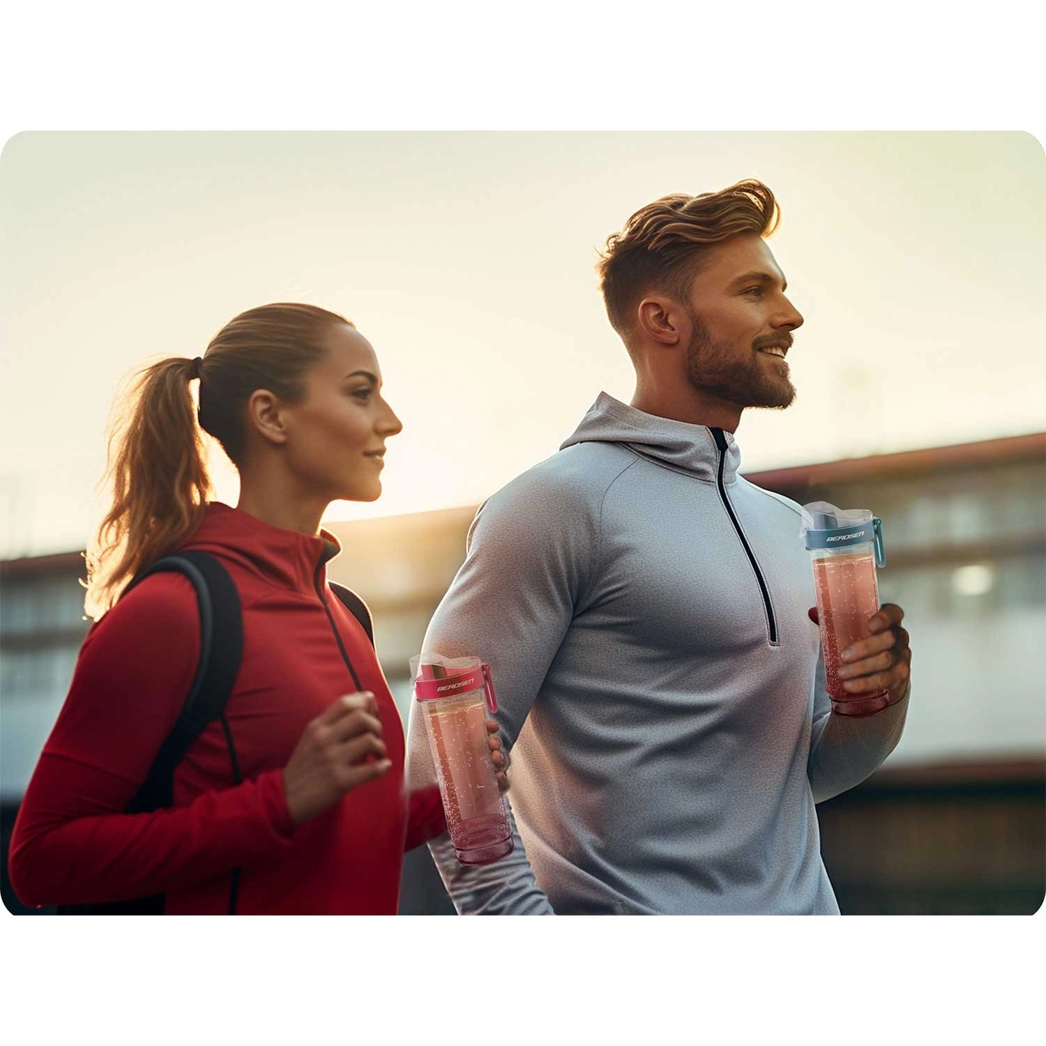 Două sticle portabile de 0,57 l cu capac anti-picurare și închideri colorate. Amesteci direct în sticlă și ești gata de drum.