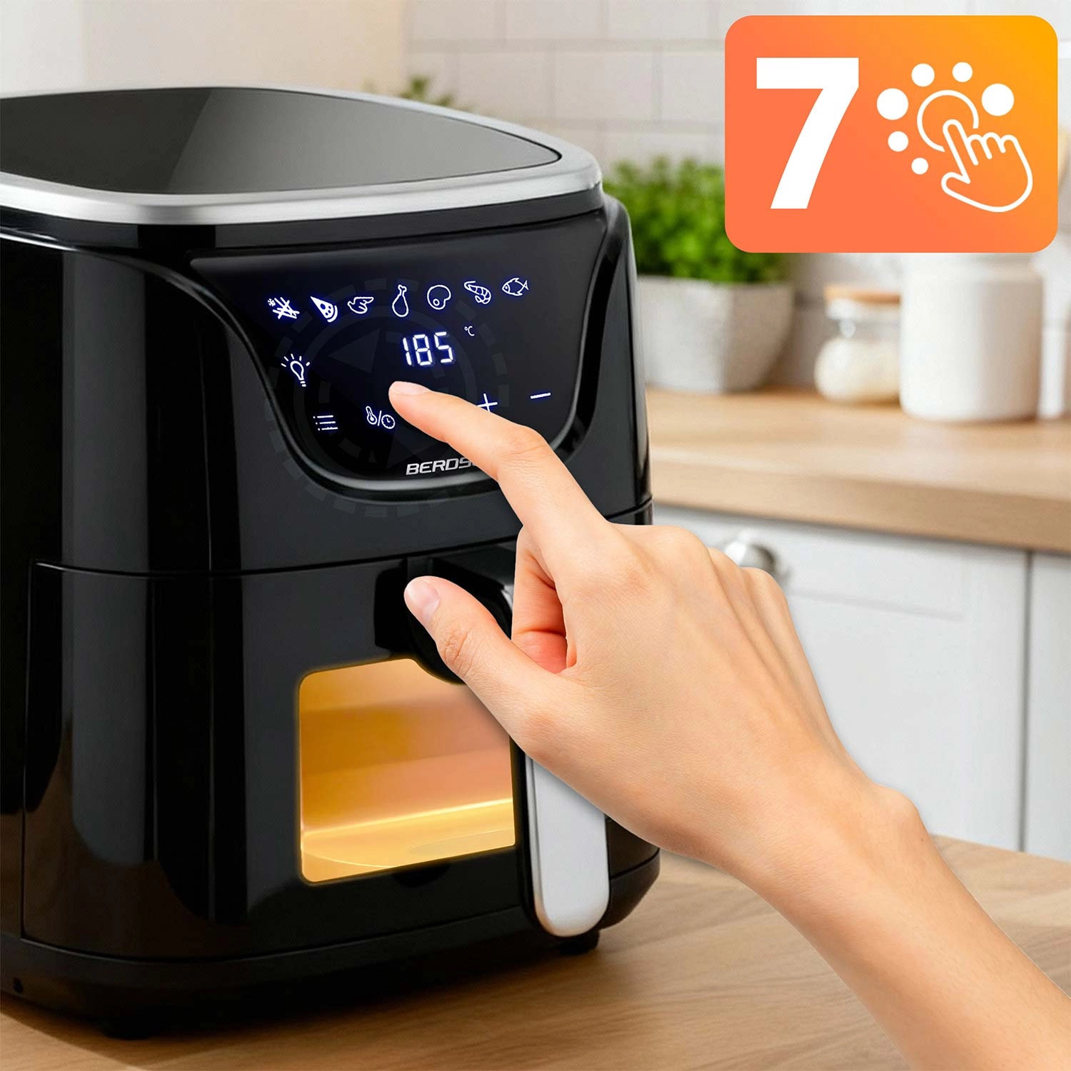 Friteuza cu aer cald BERDSEN BD-652 aduce gătit rapid și gustos fără ulei în exces. Panoul tactil modern cu pictograme clare și fereastra transparentă îți permit să ții preparatele permanent sub control fără a deschide coșul. Datorită volumului de 5 l, pregătești cu ușurință cina pentru familie, o porție mare de cartofi prăjiți pentru prieteni sau legume coapte pentru întreaga săptămână.