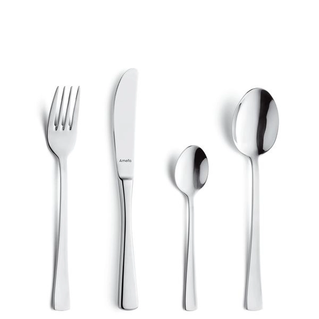 Elegantul set de tacâmuri Amefa Neptune pentru 6 persoane oferă un design modern, luciu intens și o execuție de calitate din oțel inoxidabil 18/0. Cuțitele cu tăiș zimțat și mâner plin taie excelent, iar întregul set este potrivit pentru mașina de spălat vase pentru o întreținere ușoară.