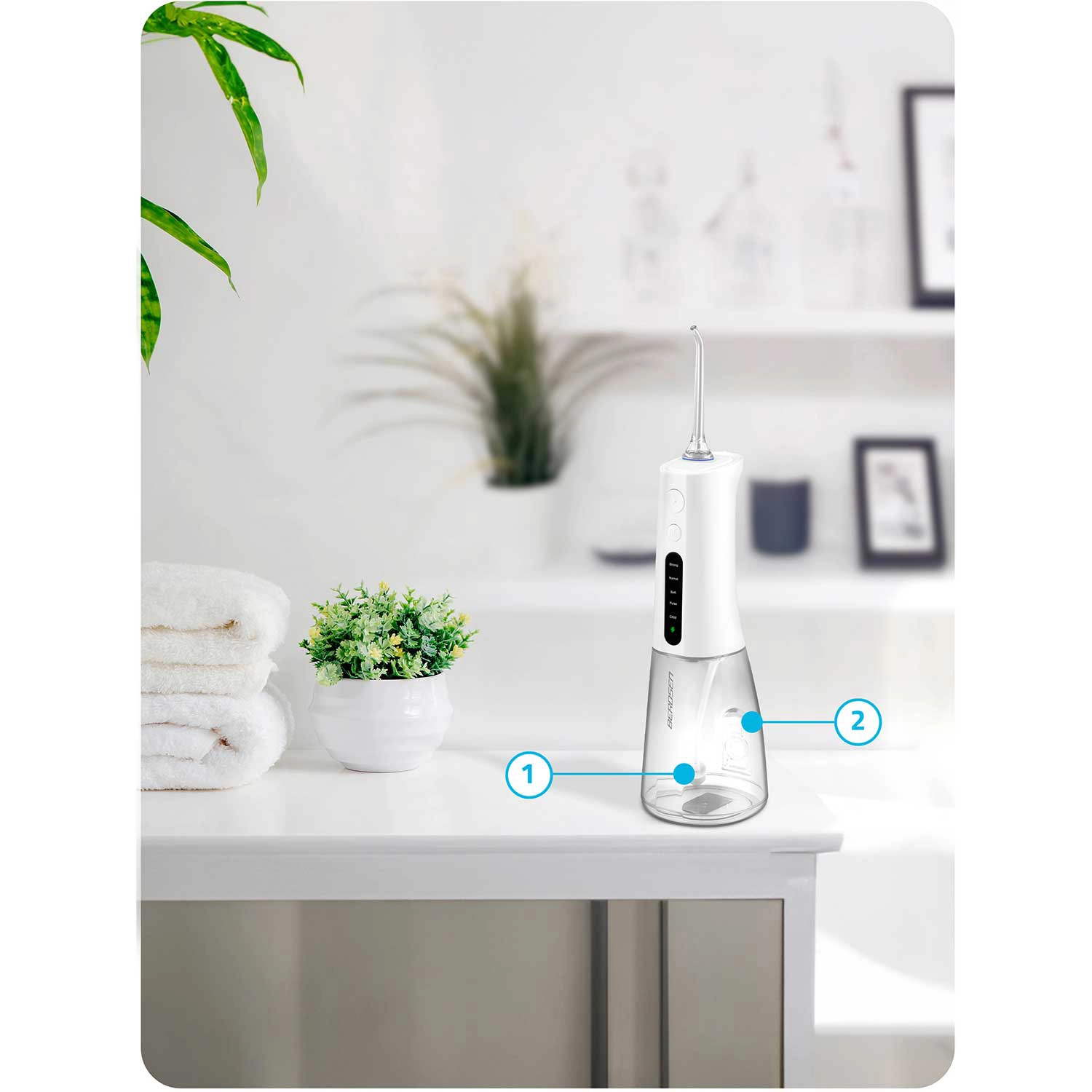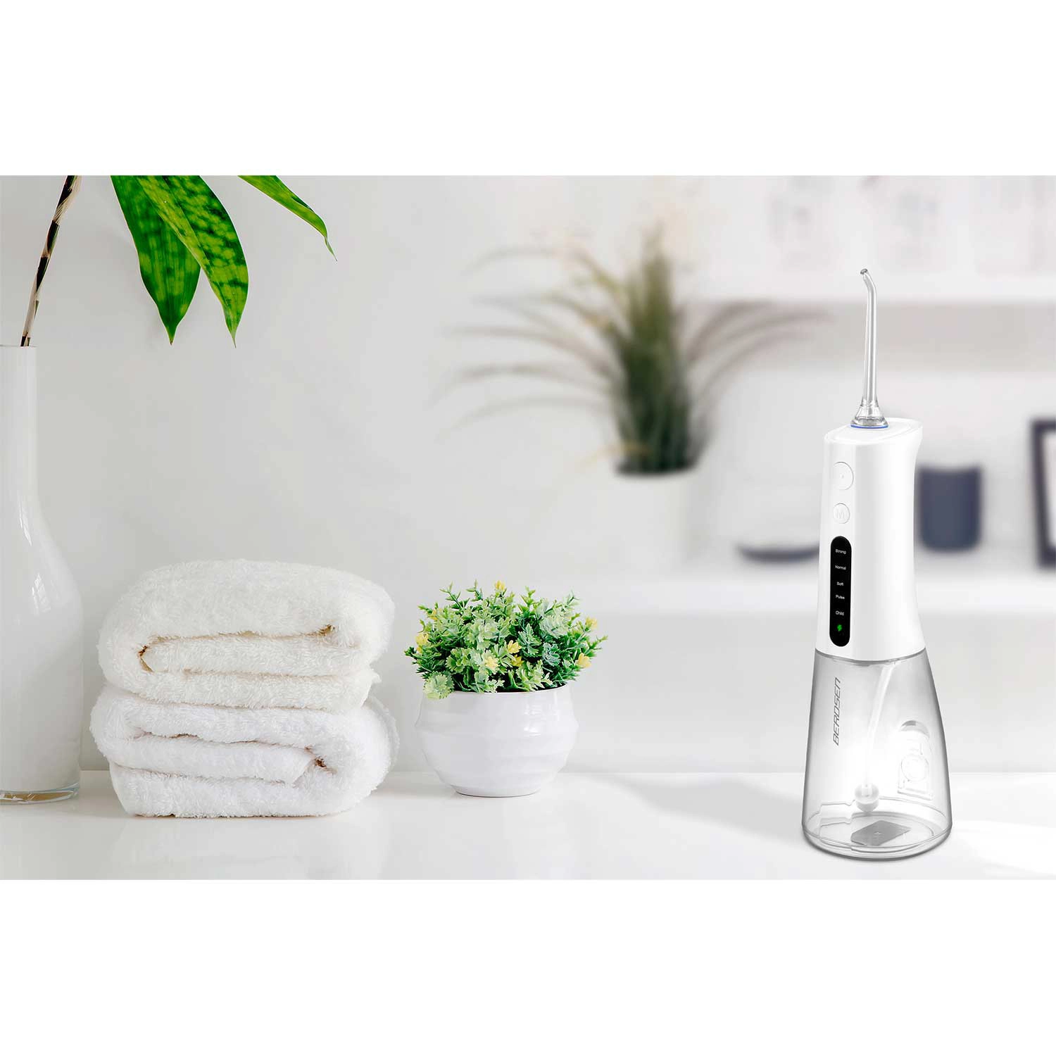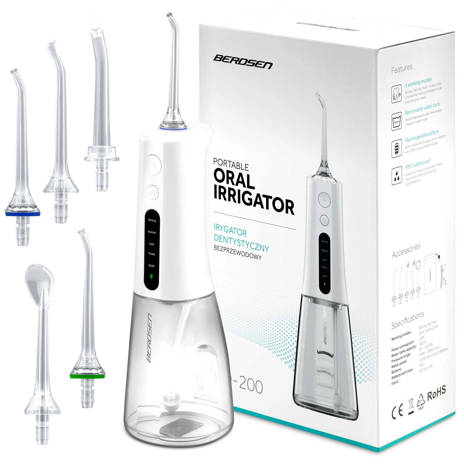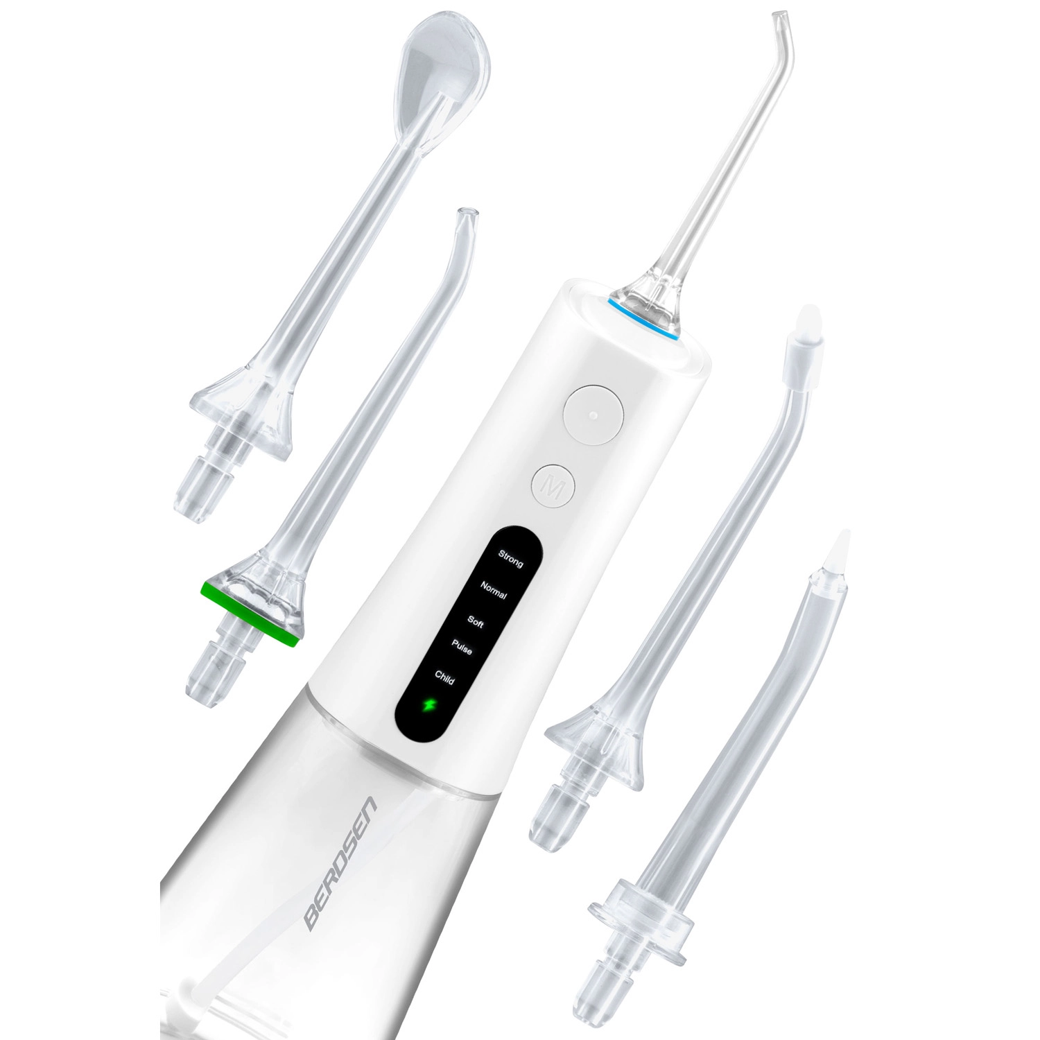 Irigatorul fără fir BERDSEN îndepărtează eficient resturile alimentare, placa și bacteriile din zonele unde periuța obișnuită nu ajunge. Este ideal pentru spațiile interdentare, coroane, punți, implanturi și aparate ortodontice. Jetul subțire de apă cu până la 1800 pulsații/min asigură o igienă precisă și o senzație de prospețime pe tot parcursul zilei.