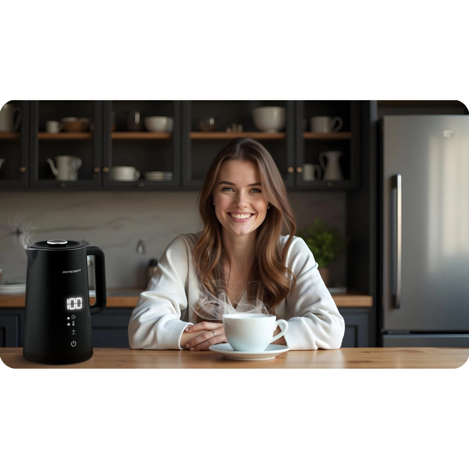 Descoperă un fierbător modern care impresionează prin aspect și funcții. Controlul tactil cu afișaj LED clar permite setarea precisă a temperaturii pentru diverse băuturi – de la băuturi pentru copii la ceai verde sau cafea prin metode alternative. Tehnologia CoolTouch cu construcție dublu strat sporește siguranța, îmbunătățește izolarea termică și reduce pierderile de căldură.