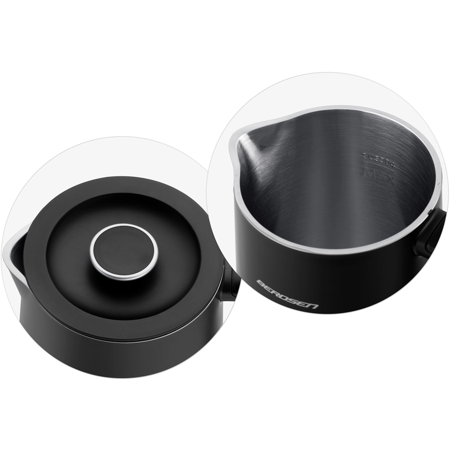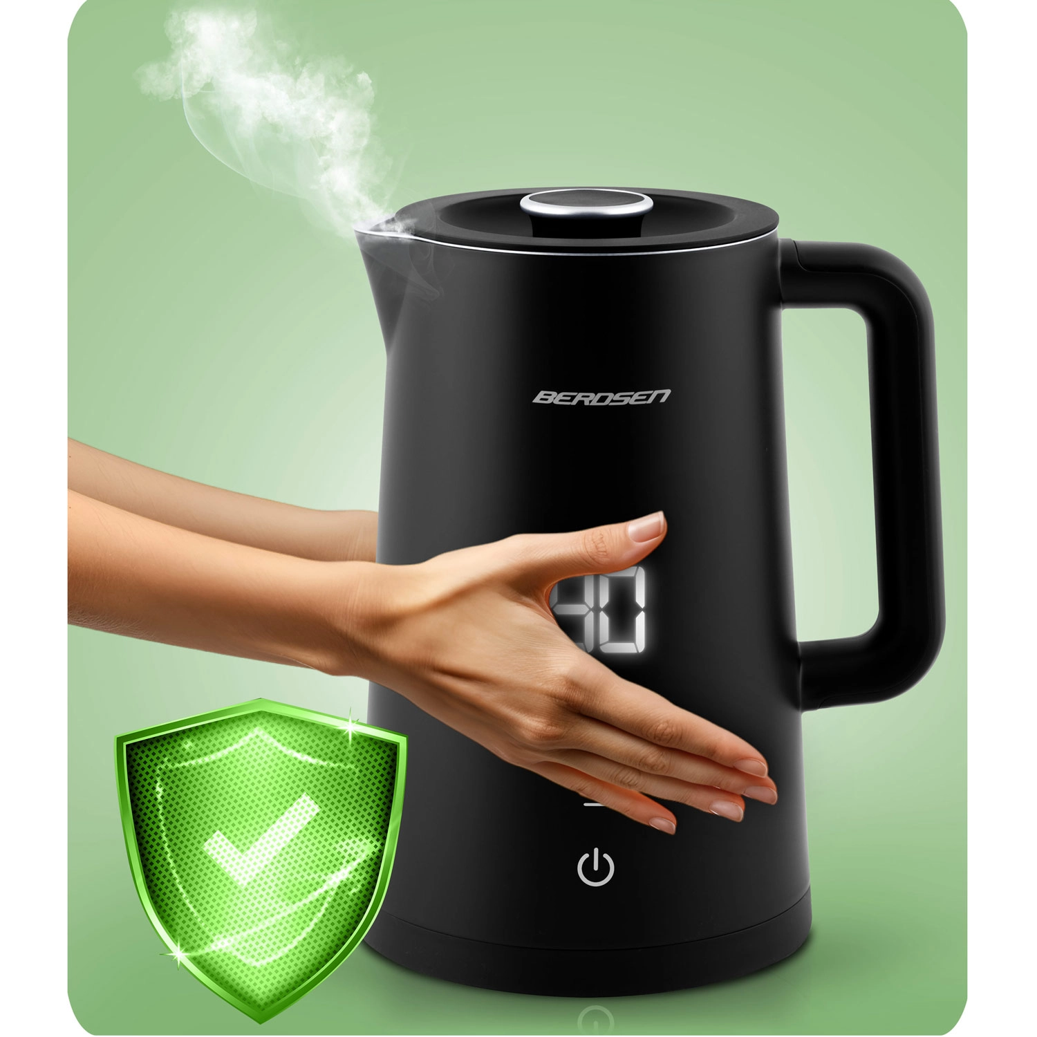 Fierbătorul electric stilat BERDSEN cu capacitate de 1,7 l oferă panou tactil cu afișaj LED, setare a temperaturii în 5 trepte (40–100 °C) și funcție de menținere a temperaturii până la 2 ore. Datorită construcției izolate cu dublu strat CoolTouch, suprafața nu se încinge, iar recipientul interior din oțel inoxidabil SUS 304 asigură gust curat al apei, fără BPA. Baza rotativă la 360°, picioarele antiderapante și capacul detașabil garantează o utilizare comodă zi de zi.