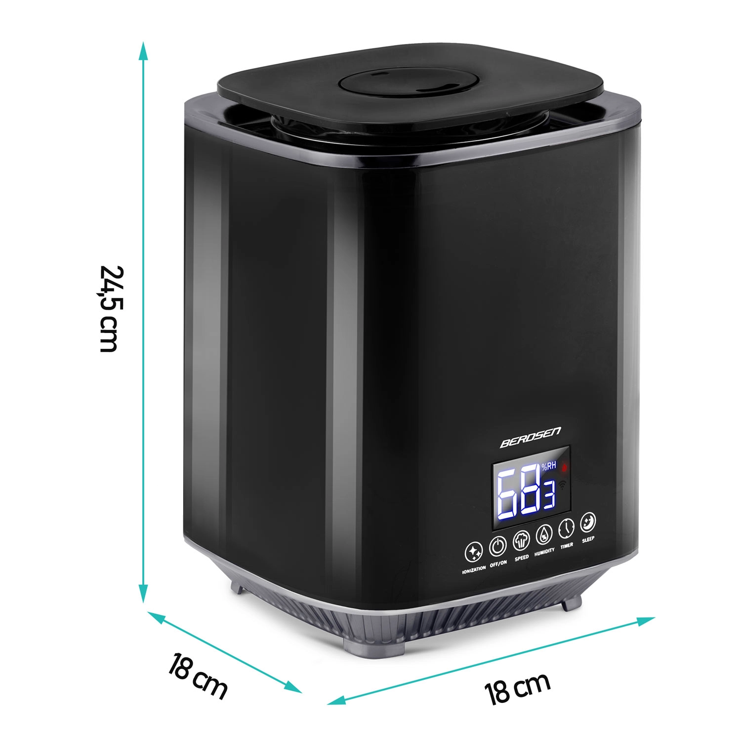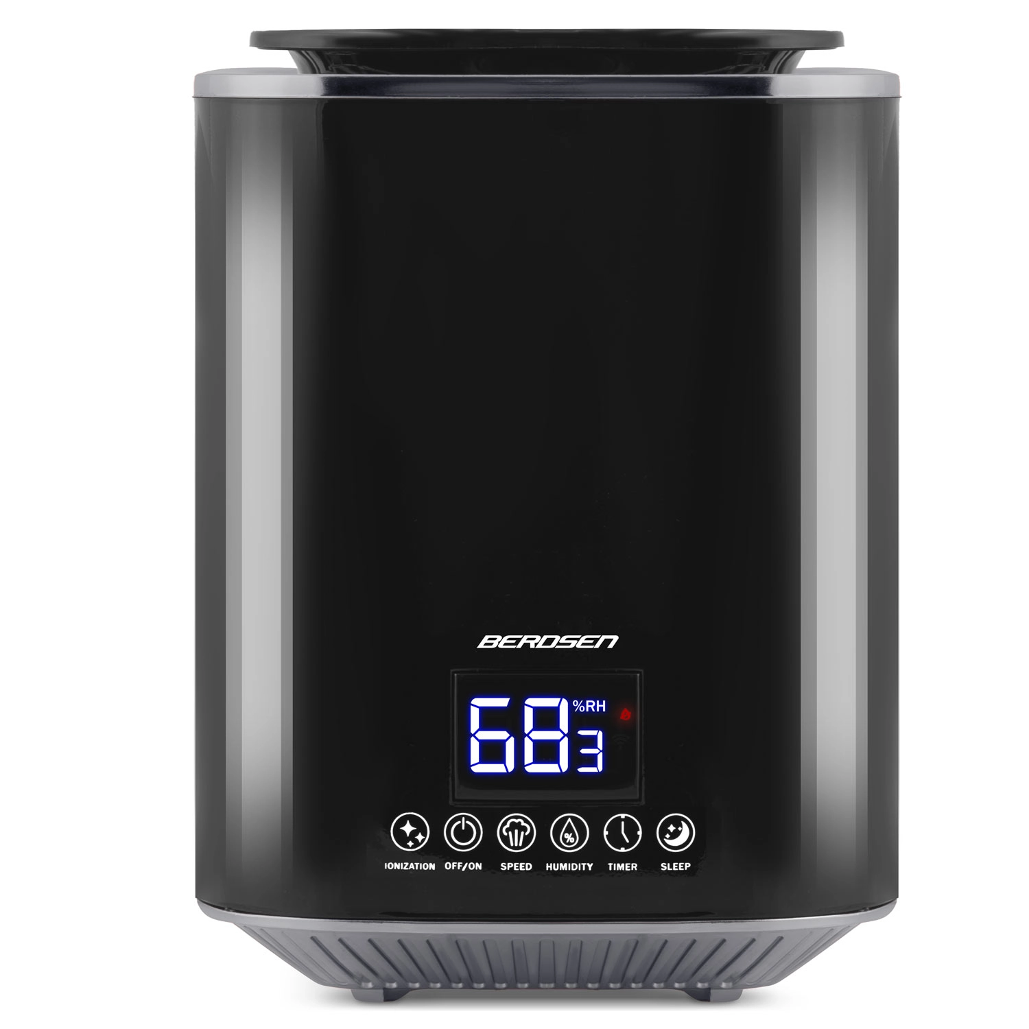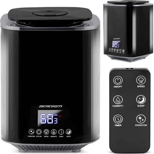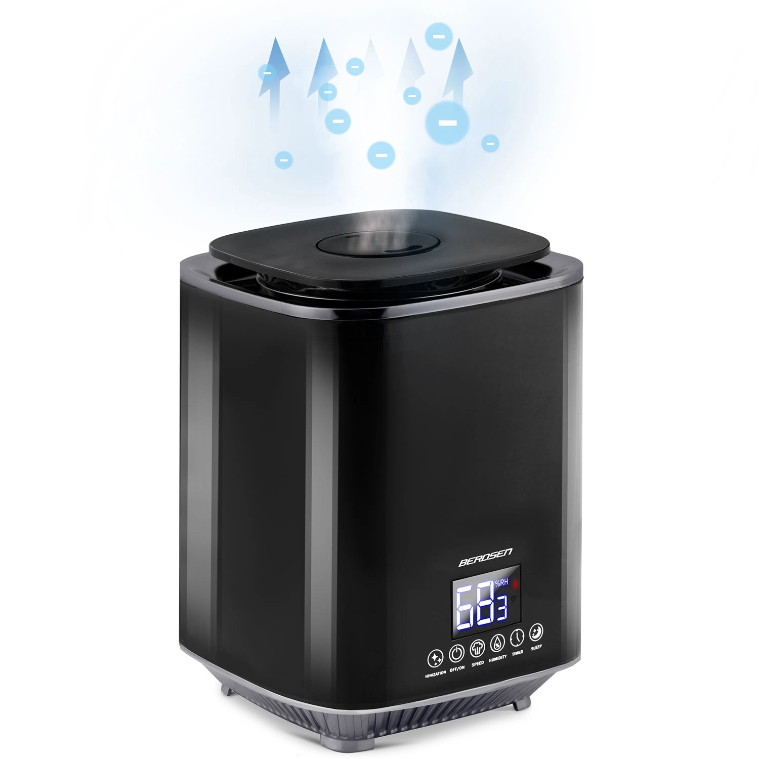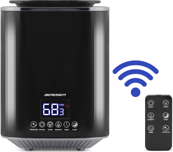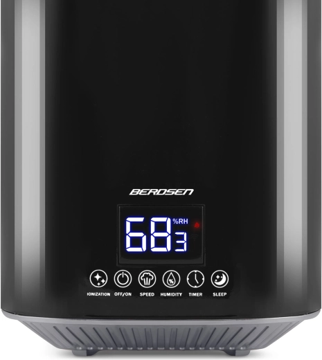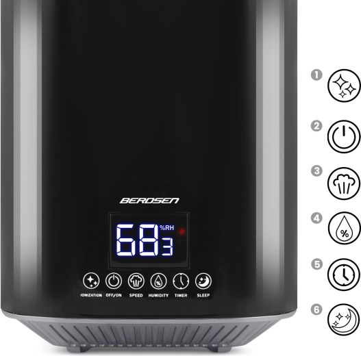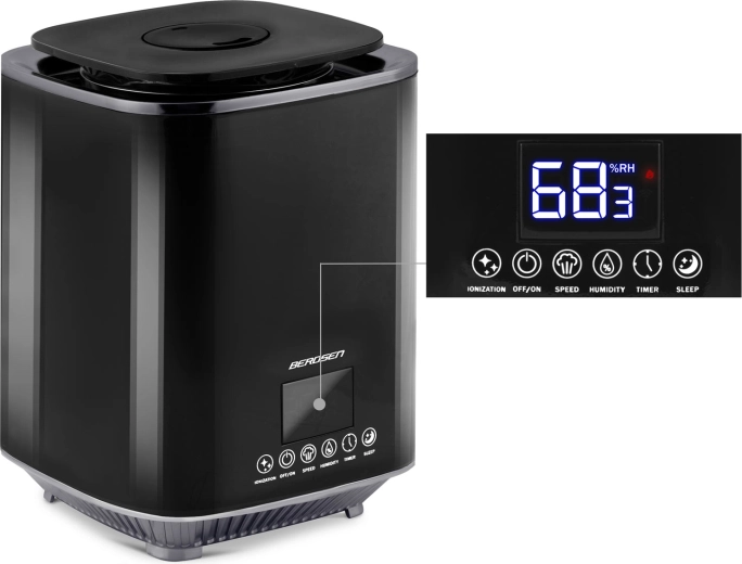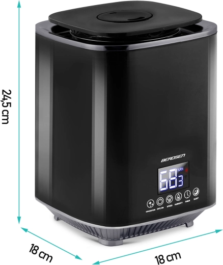 Umidificatorul de aer modern cu ultrasunete BERDSEN cu ionizare și aromaterapie asigură un climat sănătos acasă și la birou. Oferă debit de până la 250 ml/h, rezervor mare de 2,6 l, control precis al umidității prin higrostat 45–90% și higrometru încorporat. Controlul comod este asigurat de panoul tactil LED și telecomandă; include temporizator, mod de noapte și oprire automată la golirea rezervorului.