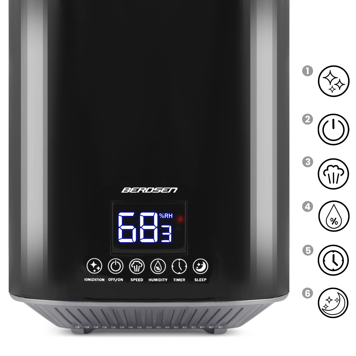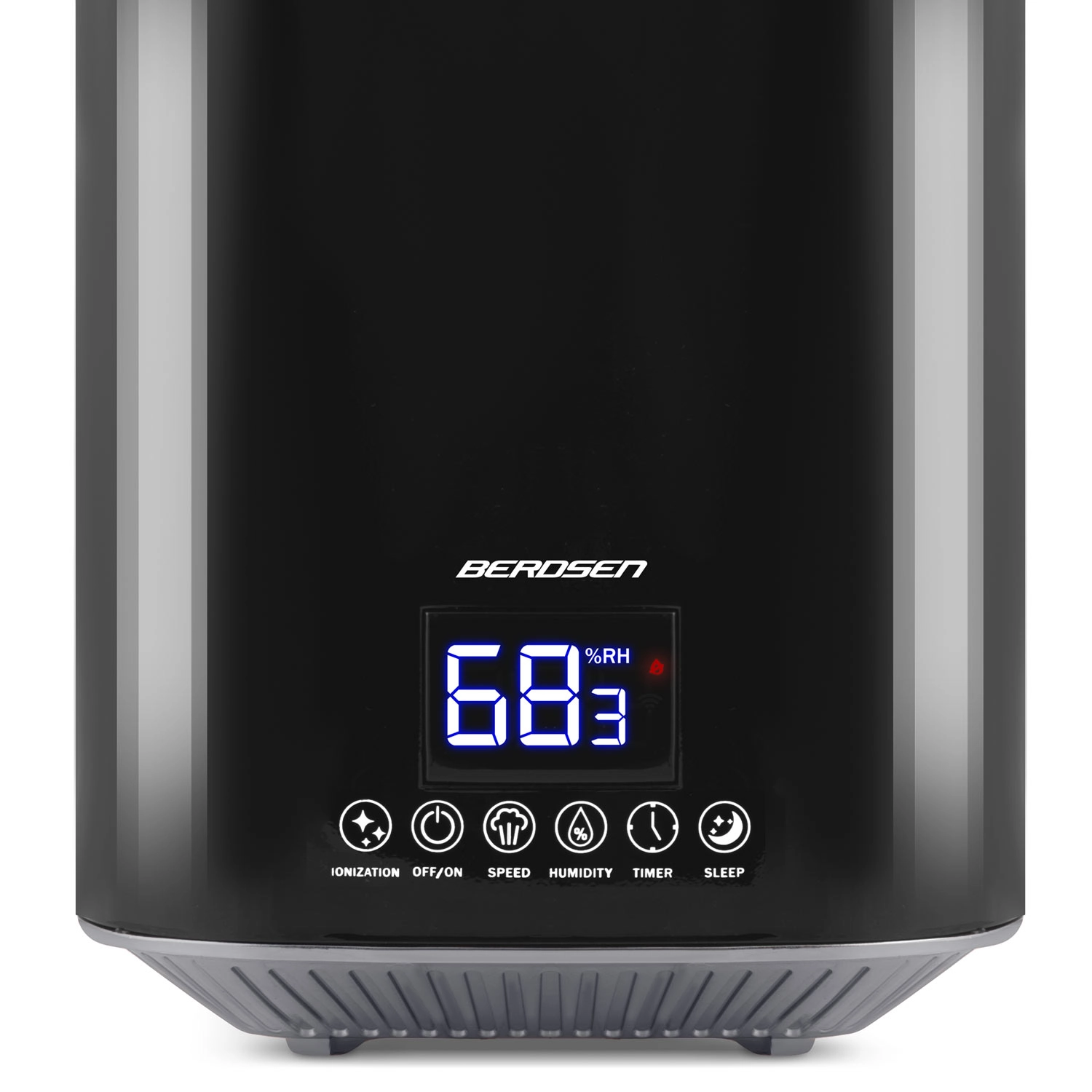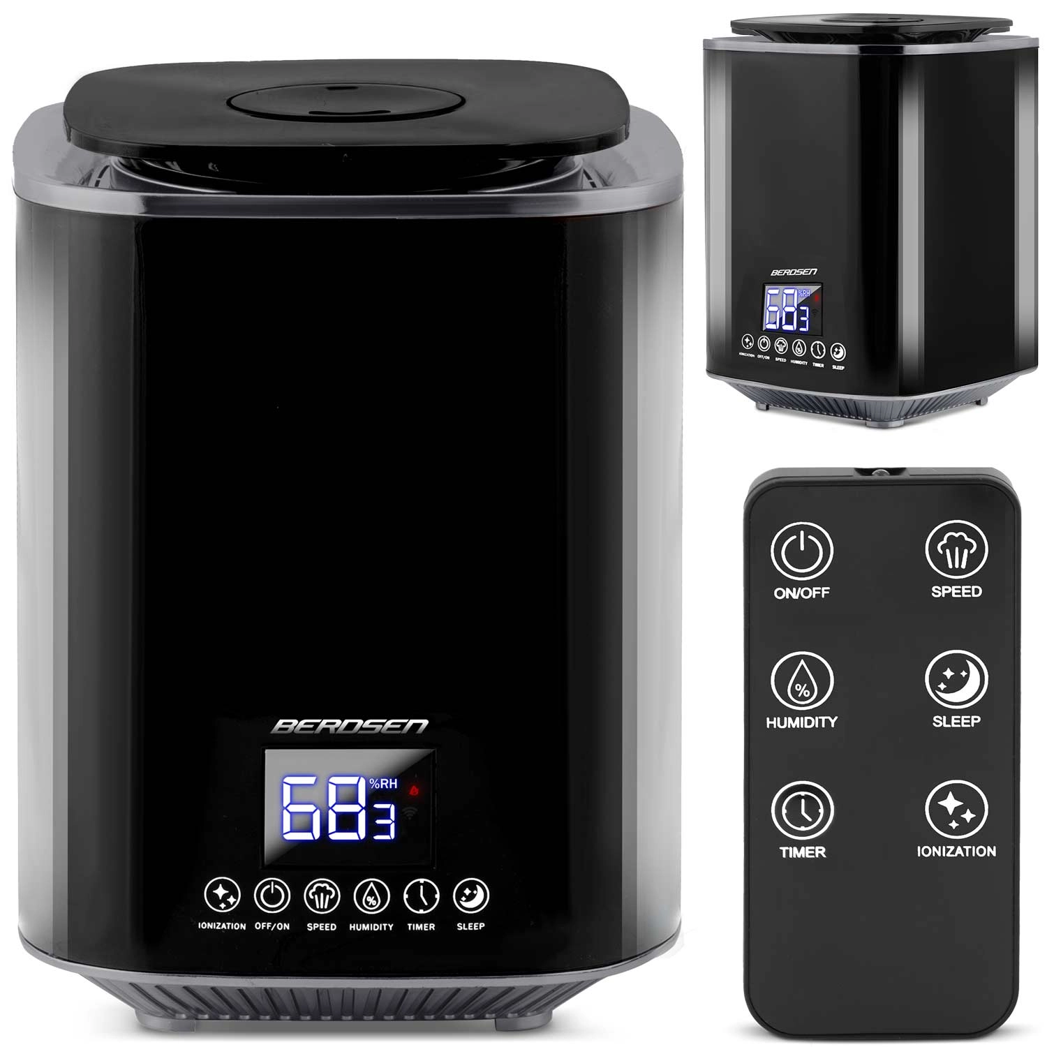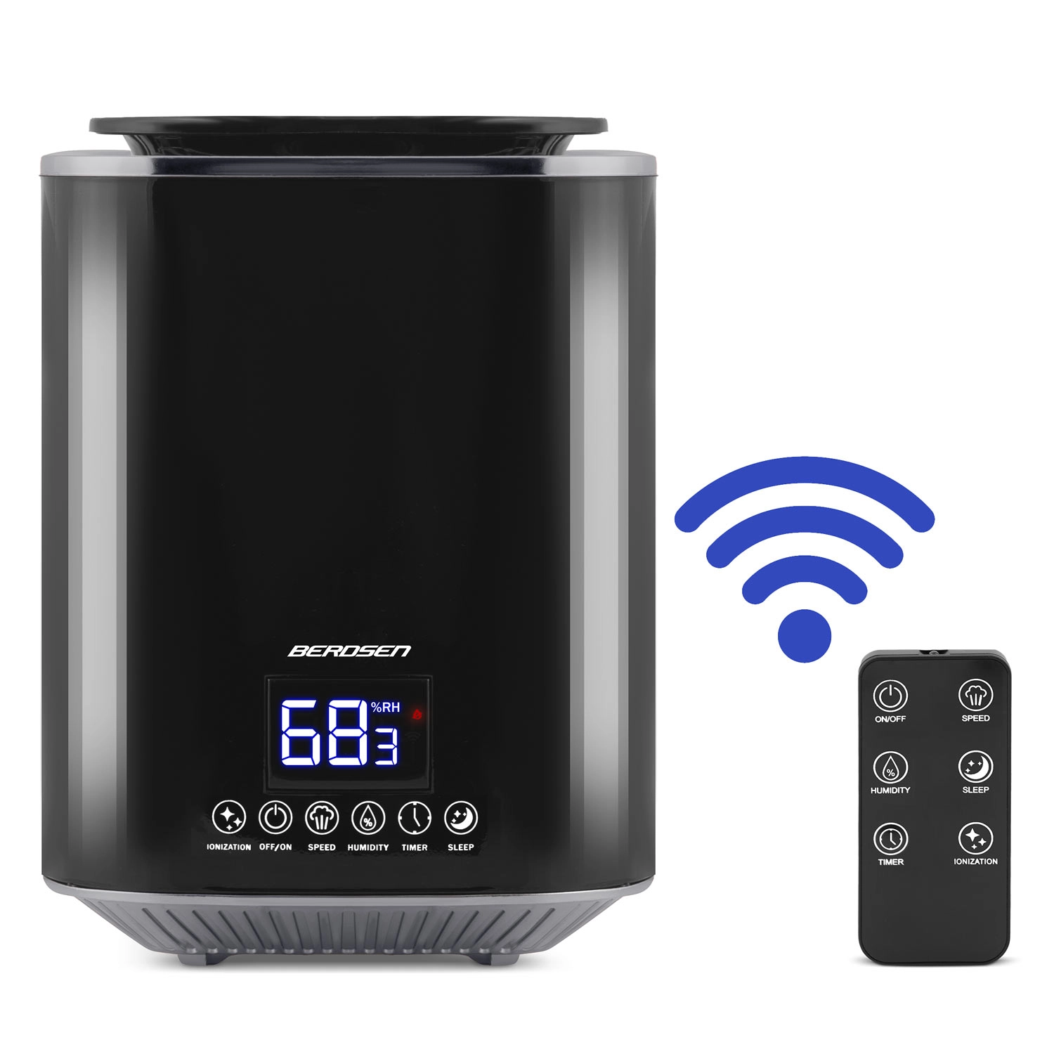 Umidificatorul de aer modern cu ultrasunete BERDSEN cu ionizare și aromaterapie asigură un climat sănătos acasă și la birou. Oferă debit de până la 250 ml/h, rezervor mare de 2,6 l, control precis al umidității prin higrostat 45–90% și higrometru încorporat. Controlul comod este asigurat de panoul tactil LED și telecomandă; include temporizator, mod de noapte și oprire automată la golirea rezervorului.