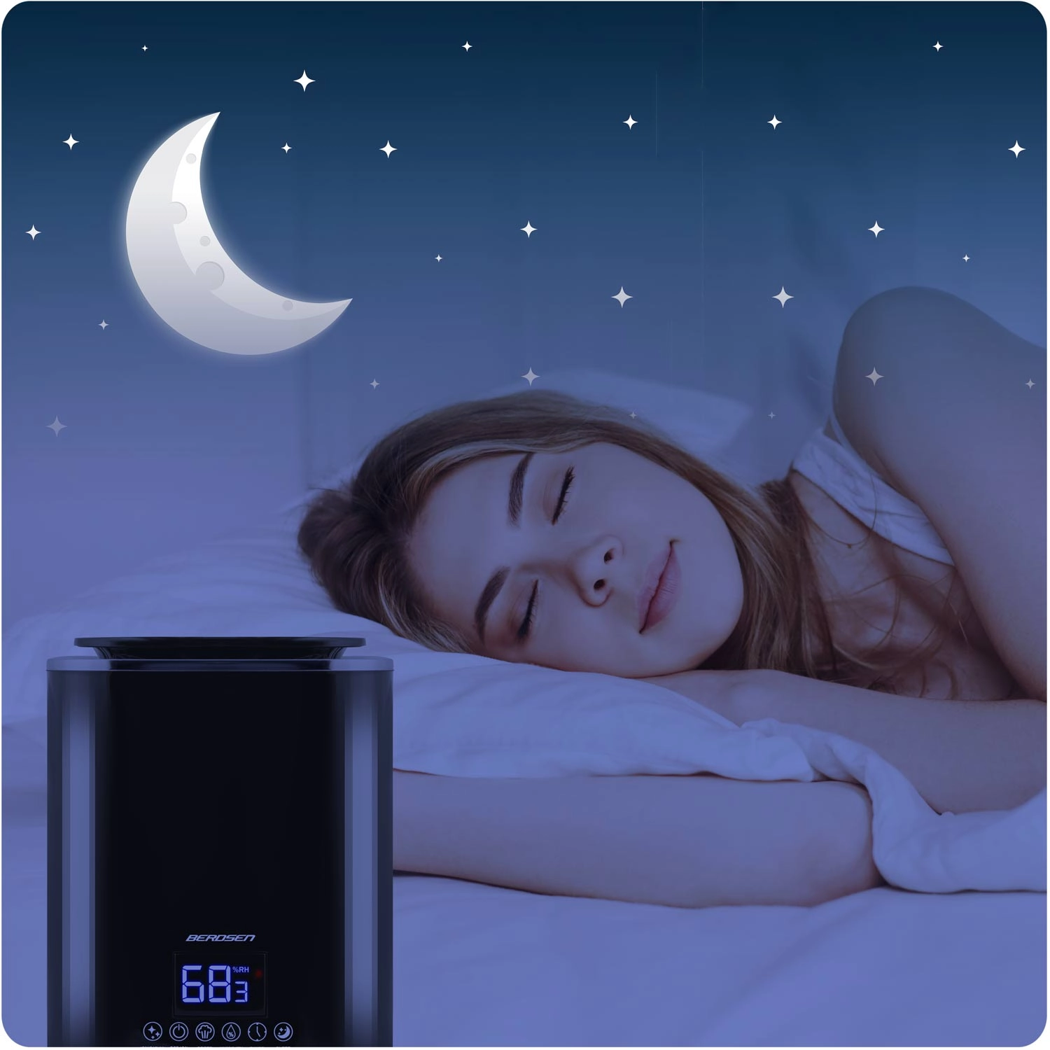 Higrostatul inteligent (45–90%) menține umiditatea setată și, după atingerea ei, comută dispozitivul în standby. Modul de noapte estompează afișajul, iar aparatul funcționează în liniște. Controlul tactil intuitiv este completat de temporizator 1–9 h și oprire automată în caz de lipsă de apă.