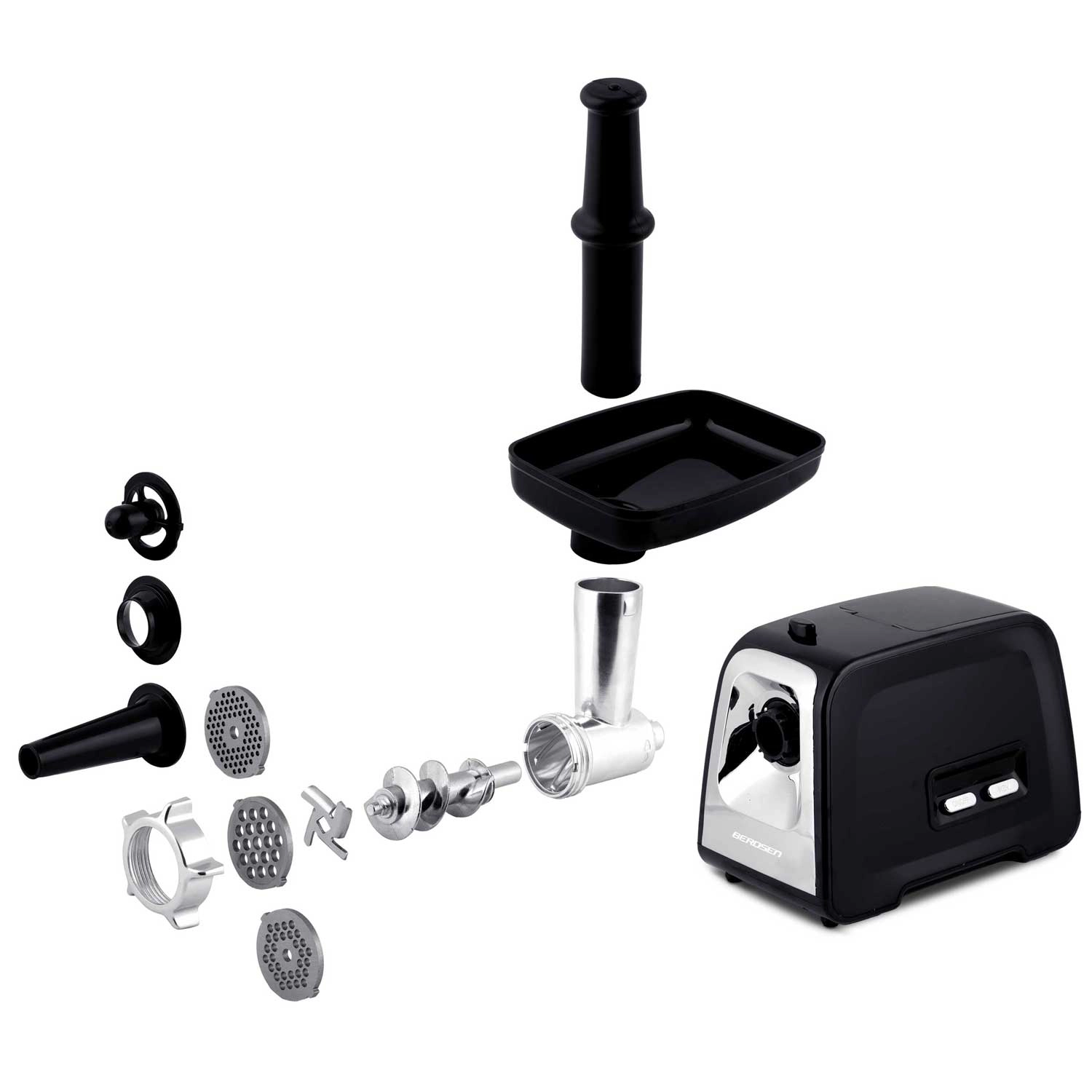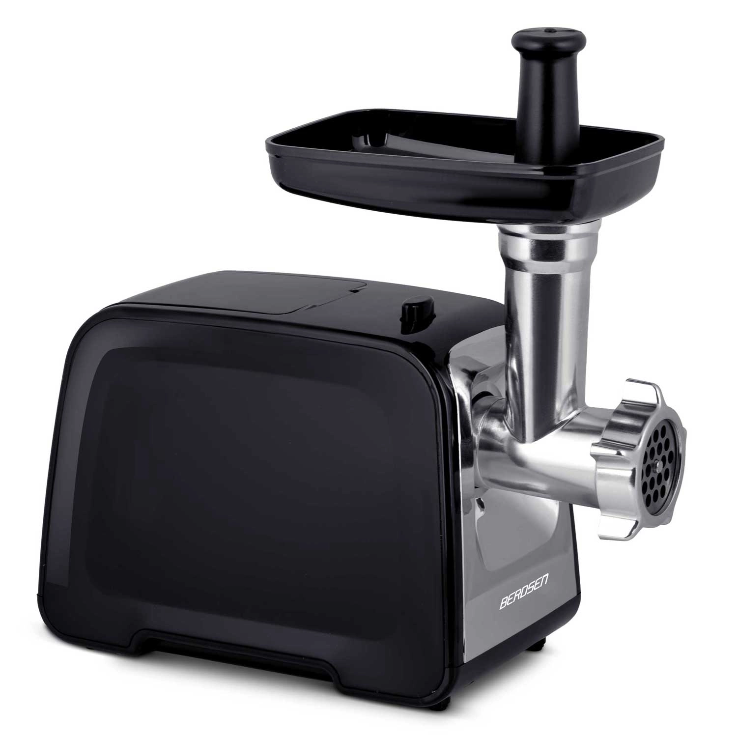 Mașina de tocat carne electrică Berdsen ușurează gătitul zilnic. Oferă un motor puternic de 450 W (vârf 1200 W), funcție de mers înapoi împotriva blocării, melc metalic și angrenaje rezistente. Datorită celor 3 site din inox (3/5/7 mm), pregătiți tocare fină sau grosieră, cârnați de casă și kebbe. Curățare ușoară, materiale sigure LFGB & BPA free și carcasă compactă cu spațiu de depozitare pentru accesorii pentru utilizare și stocare confortabile.