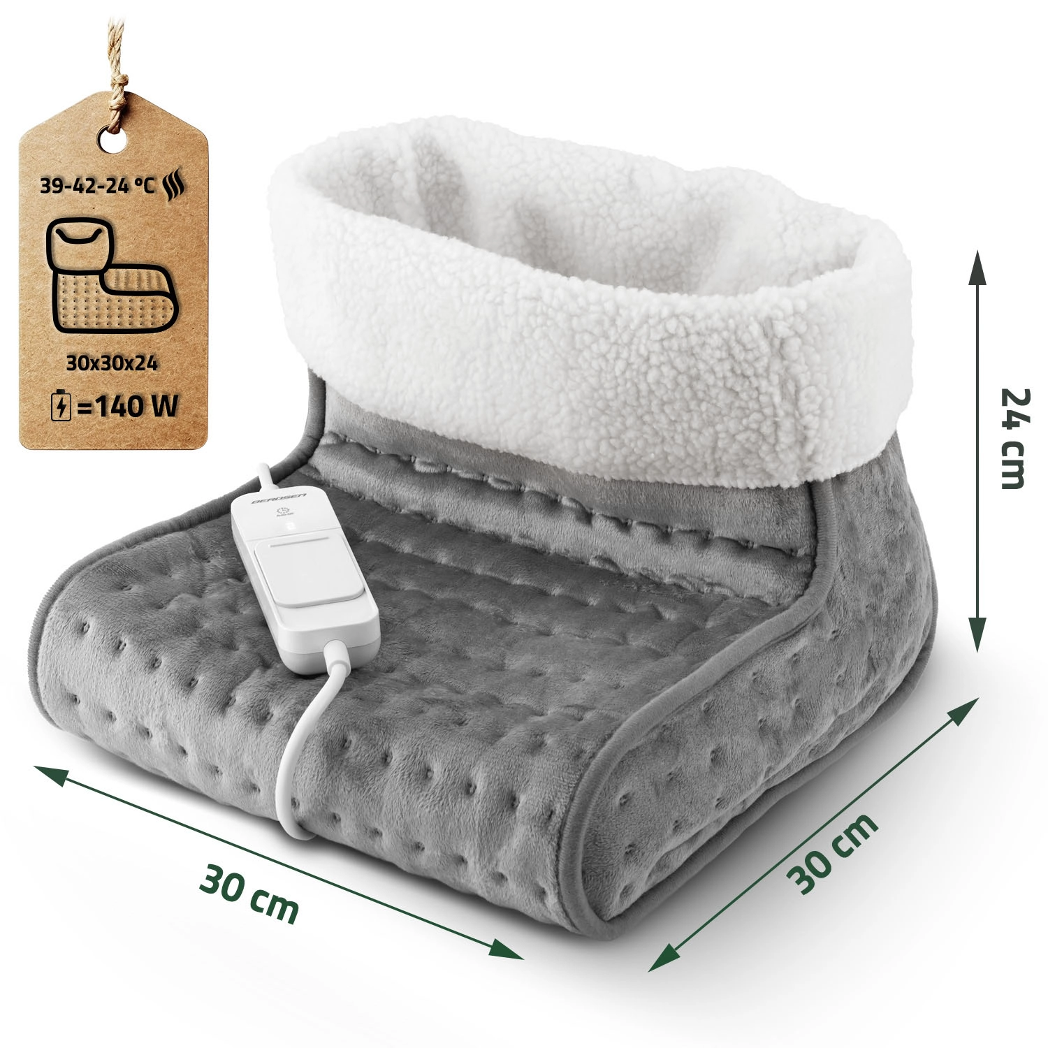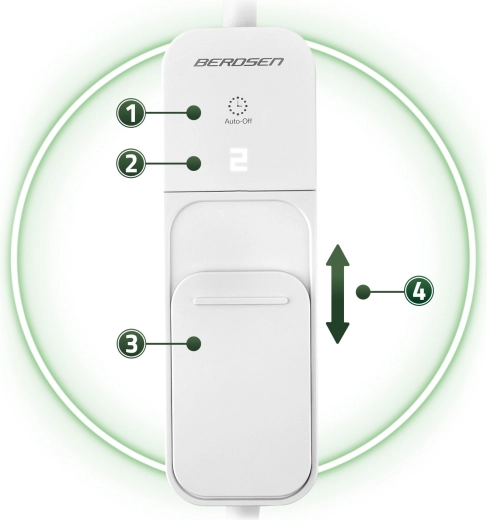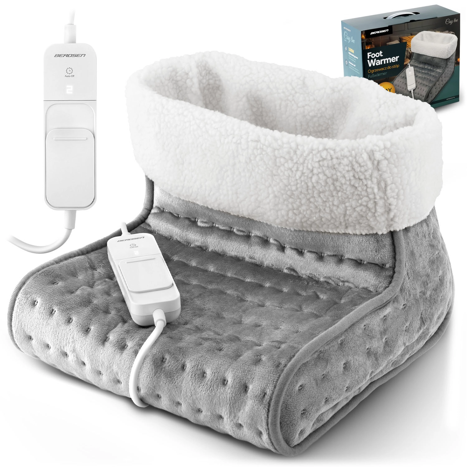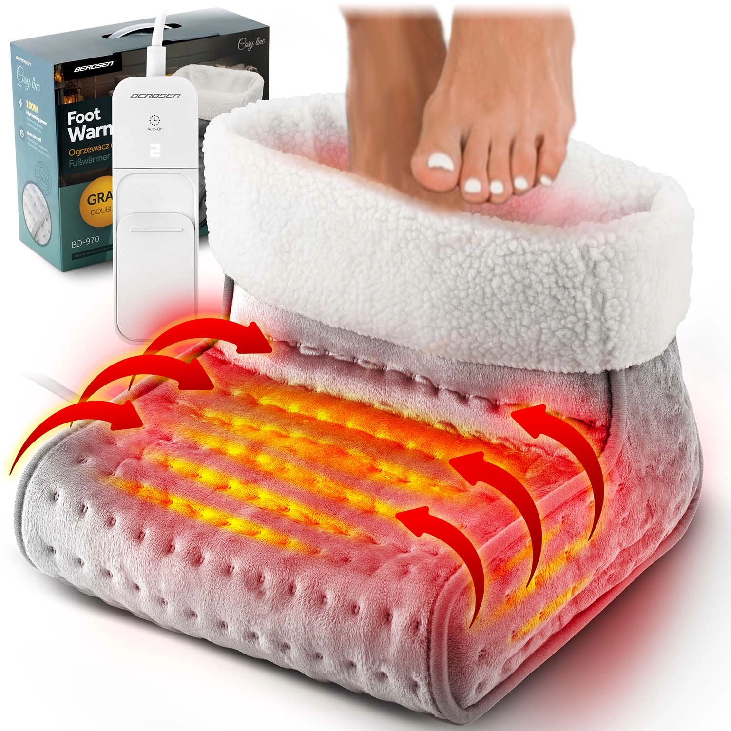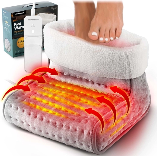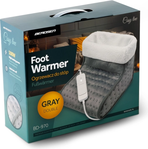 Încălzitorul pentru picioare BERDSEN este partenerul ideal pentru serile lungi de iarnă, munca la computer sau relaxarea la televizor. Distribuția termică performantă și uniformă este asigurată de o construcție în trei straturi, cu pluș dens și strat izolator, iar deschiderea spațioasă cu tiv fin găzduiește confortabil ambele tălpi. Utilizarea este intuitivă – trei trepte de temperatură (39/42/45 °C) se setează ușor pe controlerul LCD iluminat.