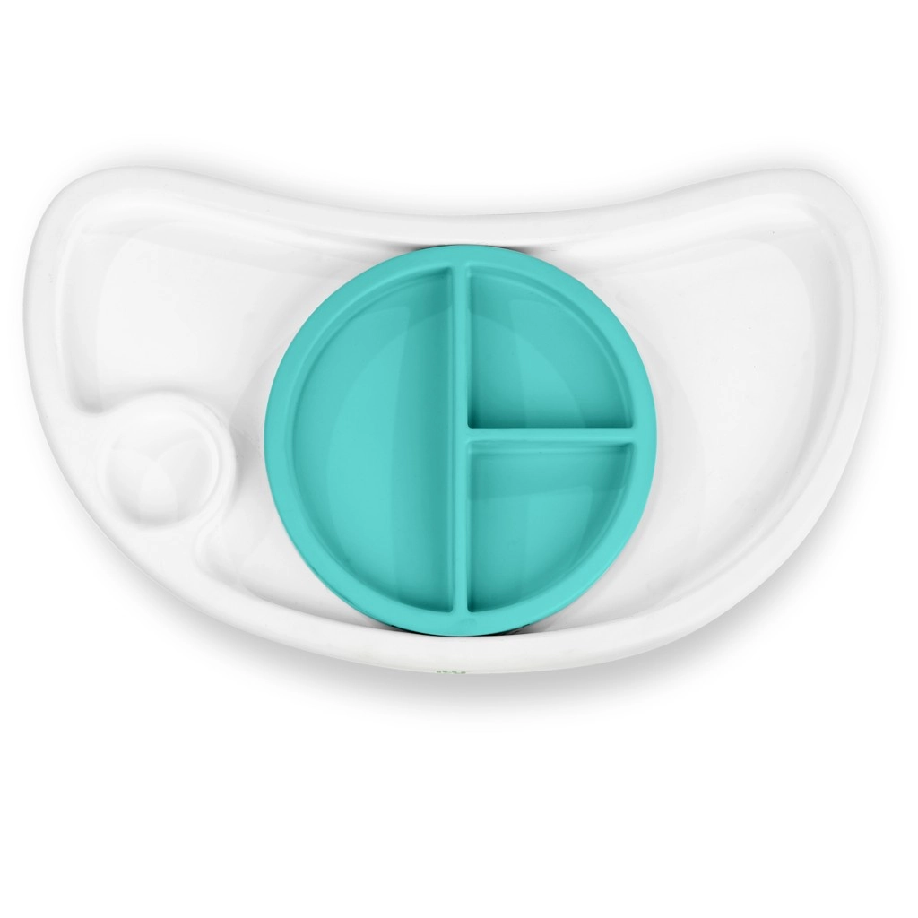 Farfuria cu trei compartimente se blochează în siguranță în tăviță, astfel încât copilul să nu o poată arunca. Este potrivită pentru cuptorul cu microunde și susține porționarea și servirea organizată.