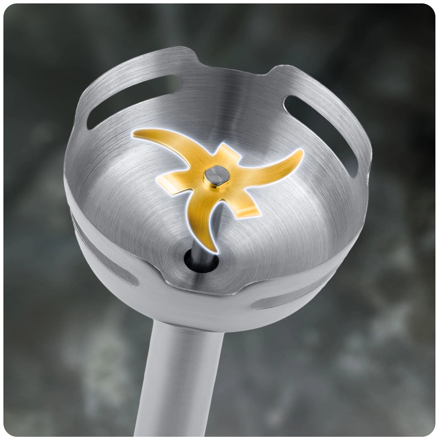 Carcasa ergonomică cu prindere anti-alunecare, execuția din inox și calitatea ridicată transformă acest set într-o unealtă fiabilă pentru gătitul zilnic – de la supe cremoase și piureuri fine până la frișcă aerată.