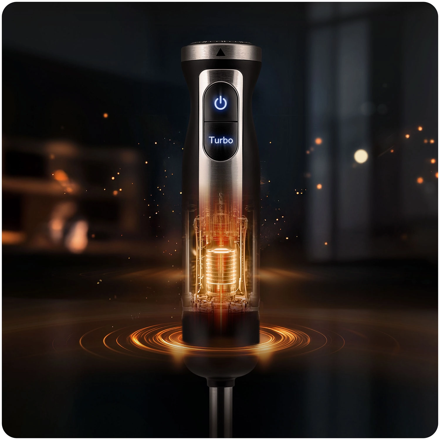 Motorul puternic cu funcție Turbo crește instant performanța pentru tocarea nucilor, zdrobirea gheții sau mixarea porțiilor mai mari. Viteză stabilă și până la 25 de niveluri de reglaj.