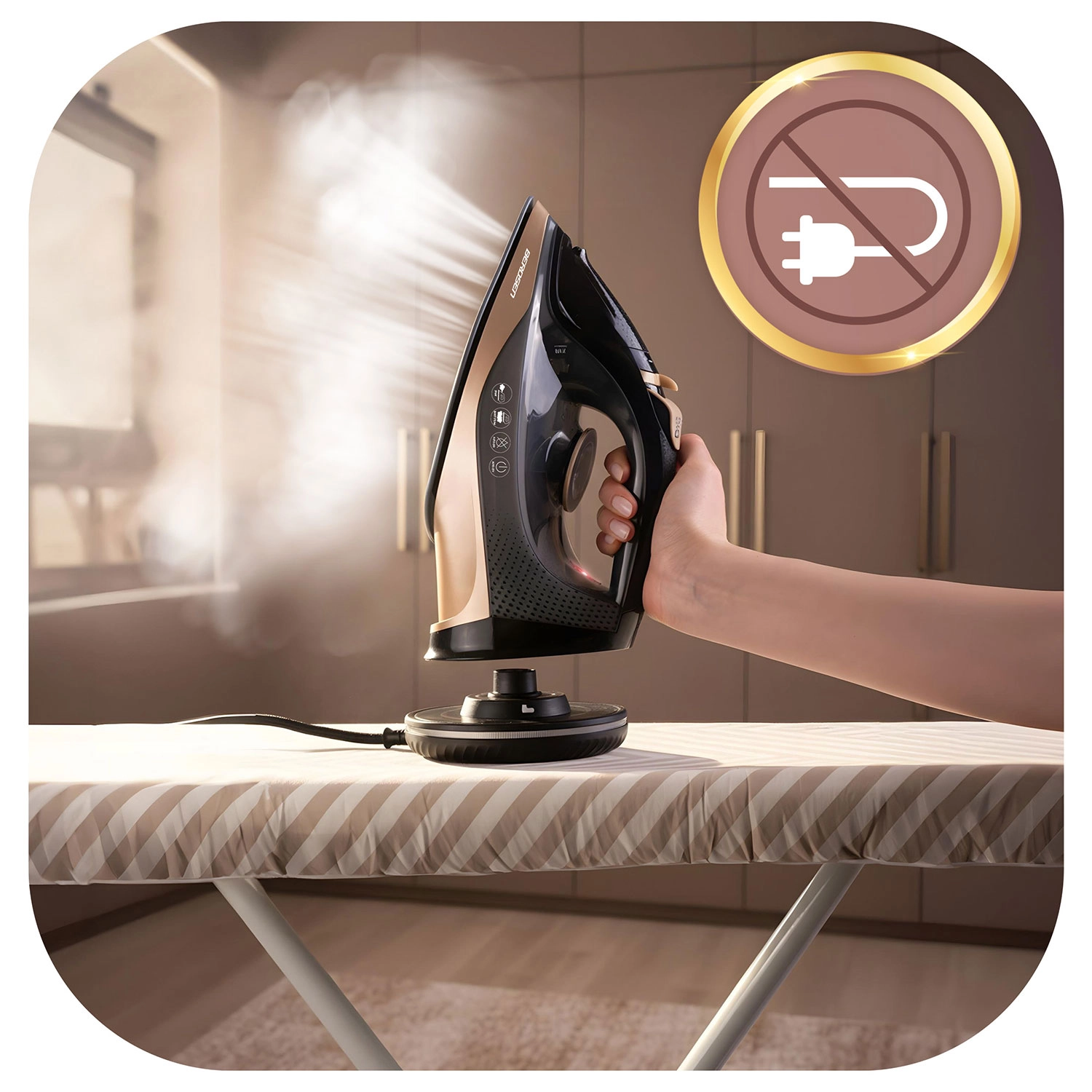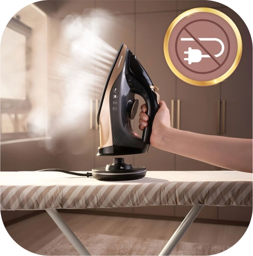 Folosește fierul liber, fără cablu, sau blochează baza și calcă precum cu un model clasic – temperatură stabilă și lucru cursiv de fiecare dată.