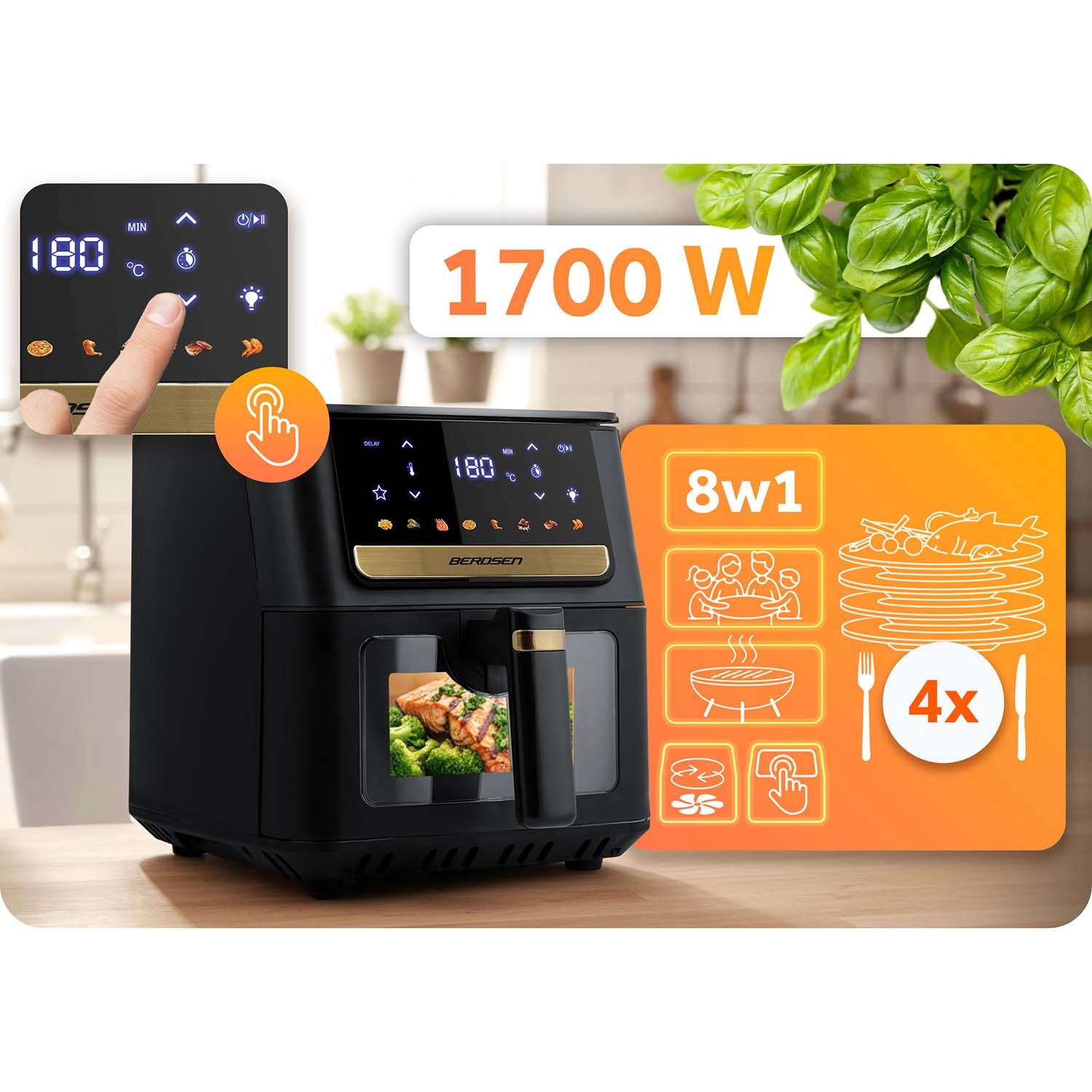 Friteuza cu aer cald BERDSEN oferă o pregătire rapidă și uniformă a preparatelor preferate, fără ulei în exces. Coșul mare de 6,5 l găzduiește porții pentru toată familia – de la cartofi prăjiți, aripioare și fripturi până la un pui întreg. Iluminarea LED și fereastra transparentă îți permit să controlezi totul fără a întrerupe coacerea, în timp ce ecranul tactil oferă pictograme clare și presetări pentru o selecție ușoară a programului.